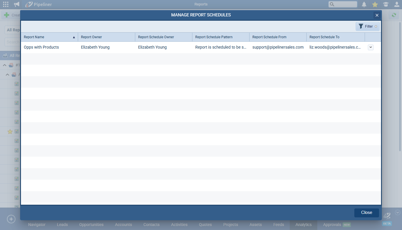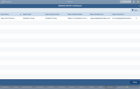 Users with the “Allowed management of schedules” permission will see a new “Manage Schedules” button within the Reports section. When clicked, this button opens a new list view titled “MANAGE REPORT SCHEDULES“.