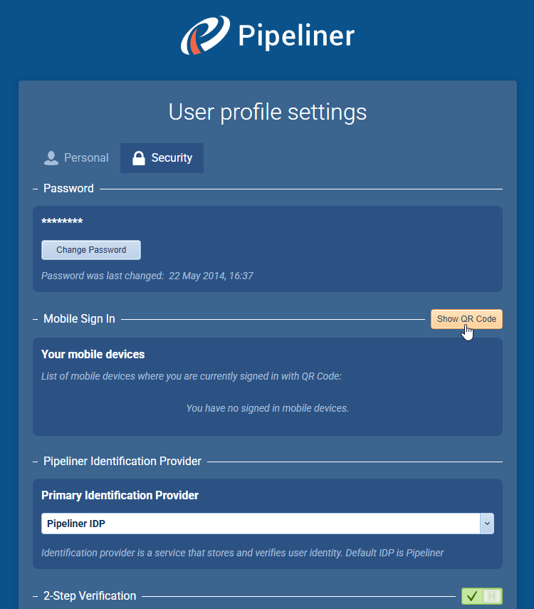 A new section named Mobile Sign In was added under the “Password” section which includes a Show QR Code button which opens the QR Code generation window. This area lists all mobile devices that have logged in to the user’s account using a QR Code. Each logged in device will show