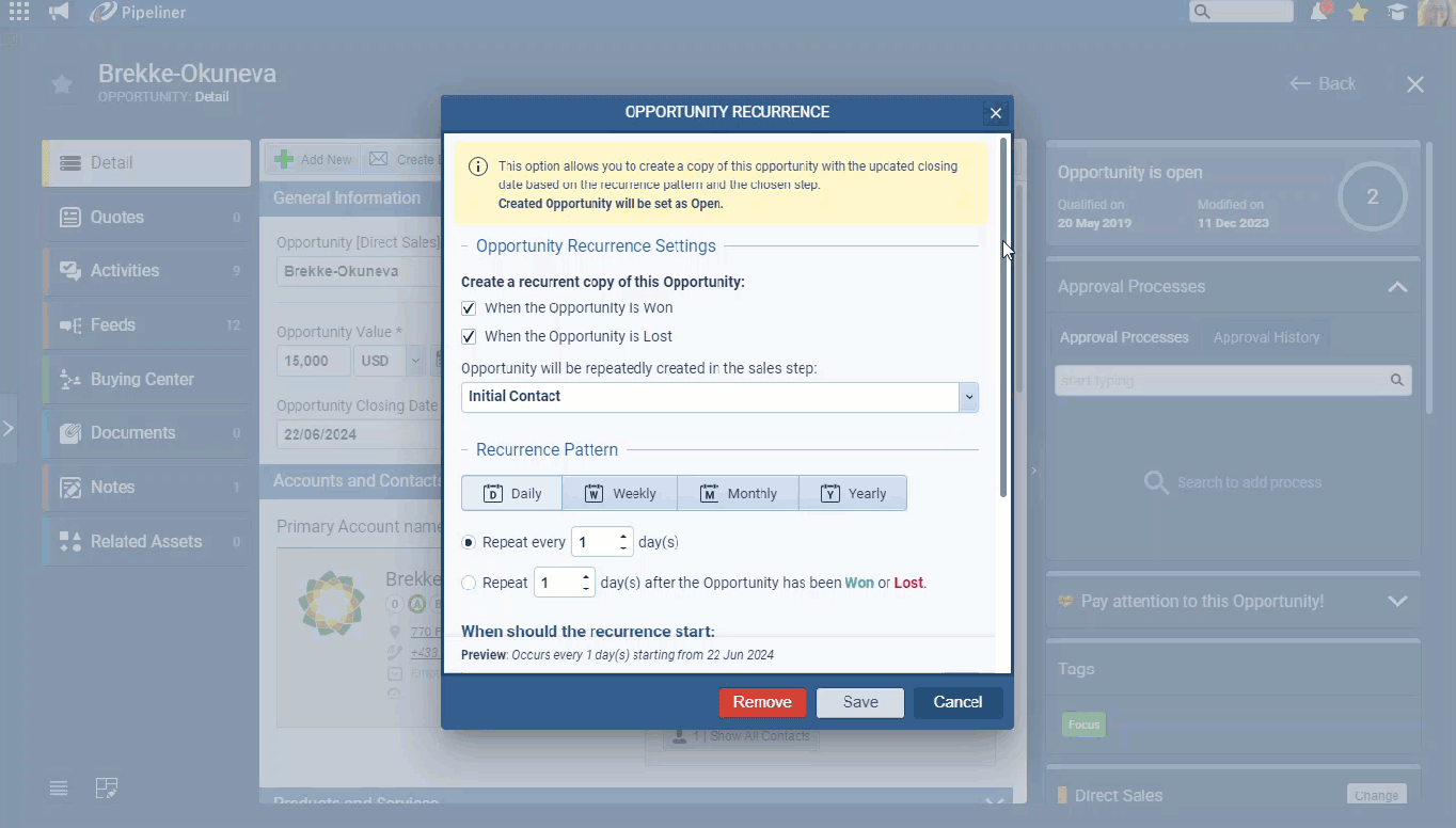 The info box at the top of the dialog tells the user what exactly will happen when the recurrence is active. We’ve also redesigned and renamed the labels and explanations for various opportunity recurrence settings. Instead of text, we’ve added an icon to each of the options in the pattern selector for better recognition and visual separation while browsing the settings (i.e. similar to a target period) and updated the visual status cue (green for Completed or Won, red for Lost) used throughout Coevera. The “Preview” footer summarizes the effect of the settings so that users can clearly understand their selections.