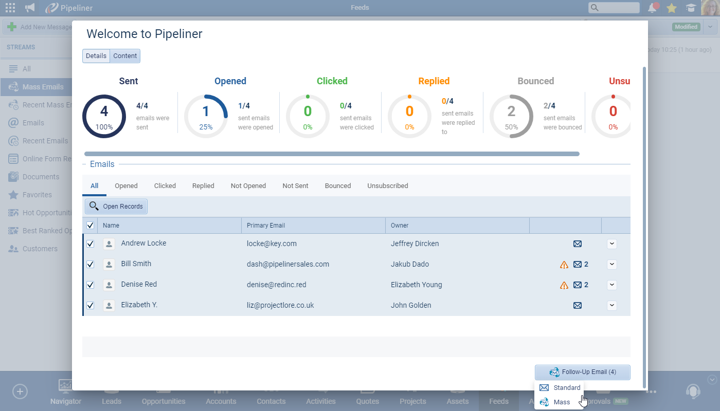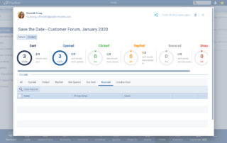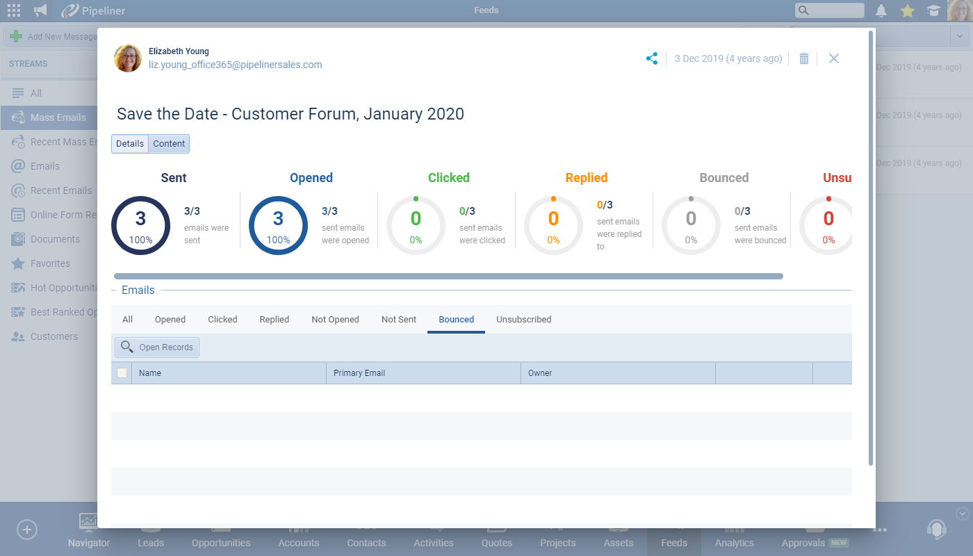 The “Mass Statistics” report now includes a tab for “Bounced” emails and there is also a visual “alert” symbol to indicate when at least one email has bounced and the same indicator is shown against the specific bounced email address. ⤵