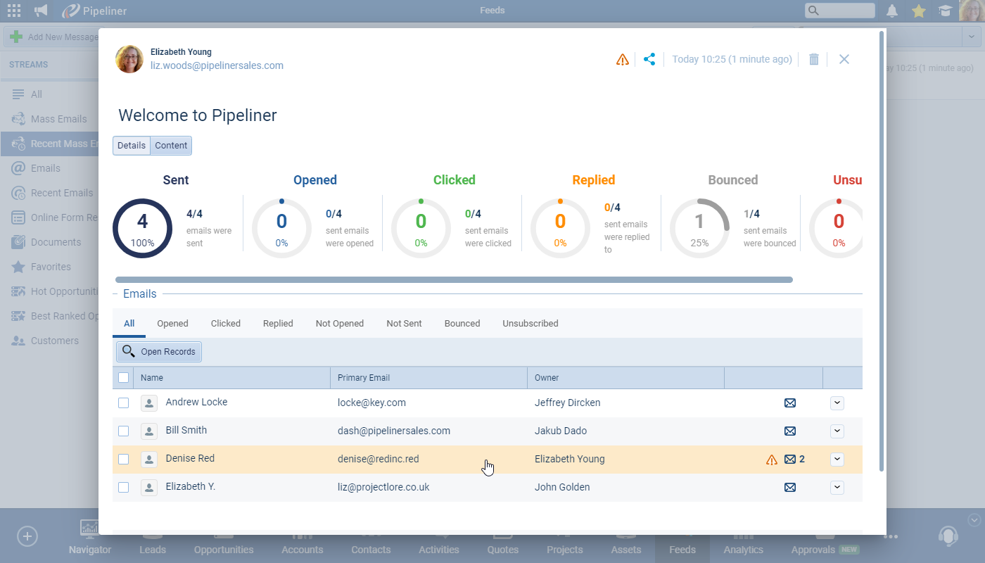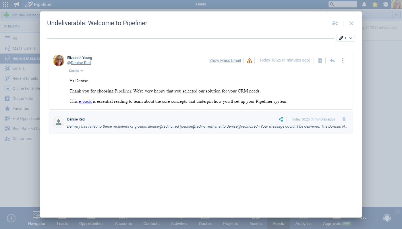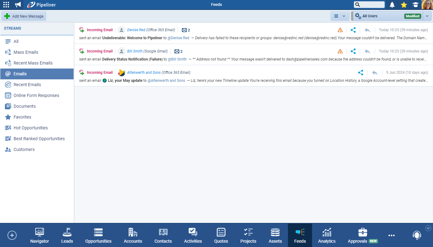 Outgoing emails that have bounced will also display the indicator in the “Feeds” tabs. ⤵