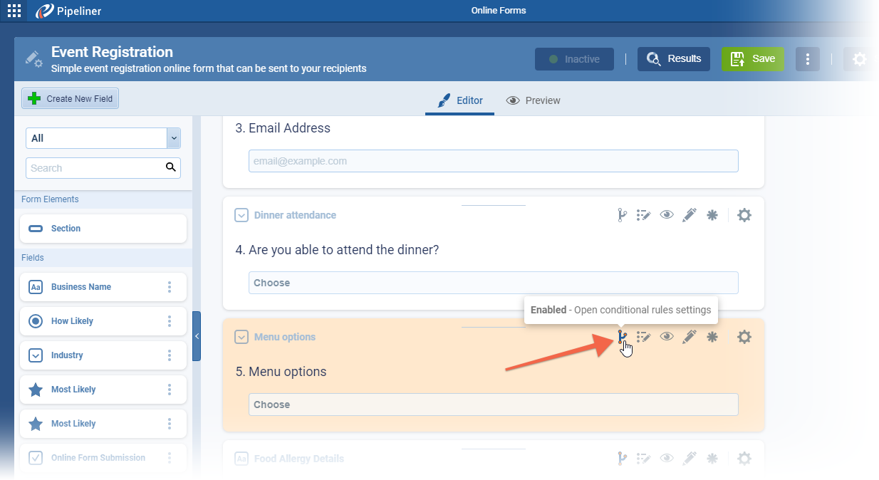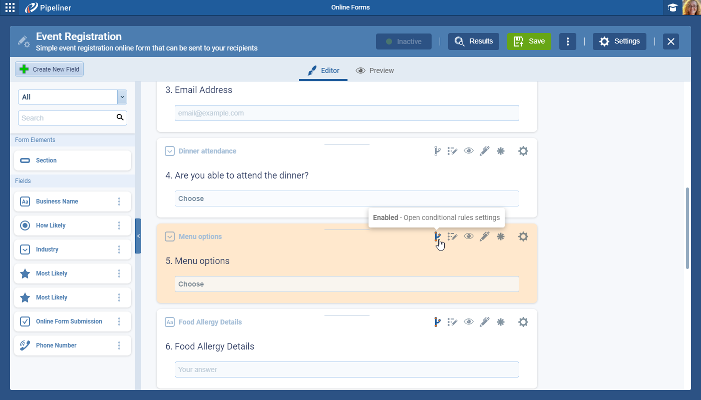 The “Conditional Rule Indicator” in the Form Editor will show if a rule is enabled or not. Clicking on the “Indicator” will open the respective tab. ⤵