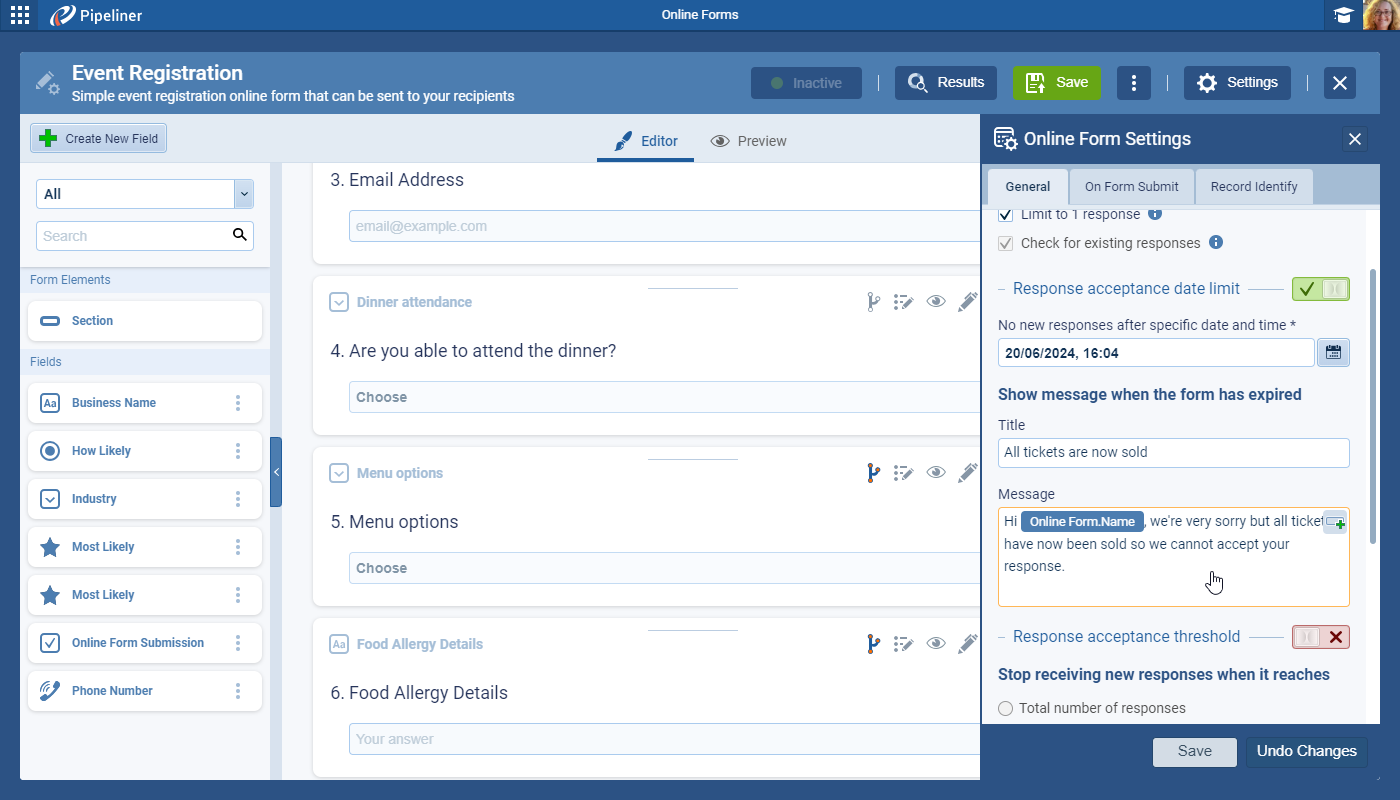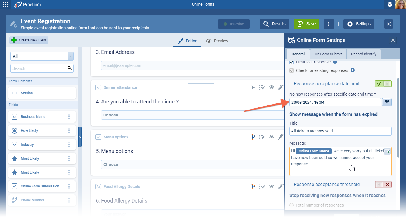 By enabling this option, the form will stop accepting new responses after that specific date & time. The respondent will see the custom message when their form submission is after the set date & time (the custom message can have personalization enabled). ⤵