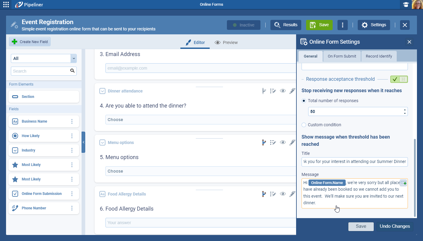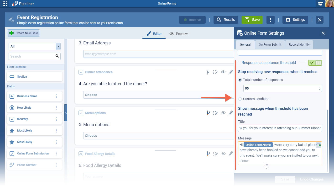 - You are organising an event which has a limited number of attendees (let’s say a maximum of “50”), so if “10” recipients answer “I want to attend” and then these people also fill another field “How many people are going with you” with “4“, the form will summarize the answers and stop allowing new responses.