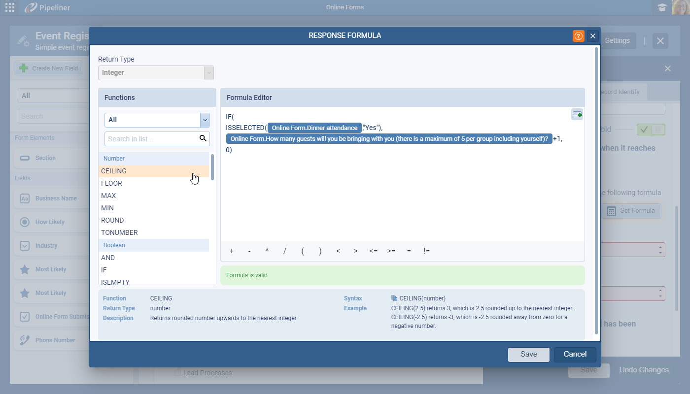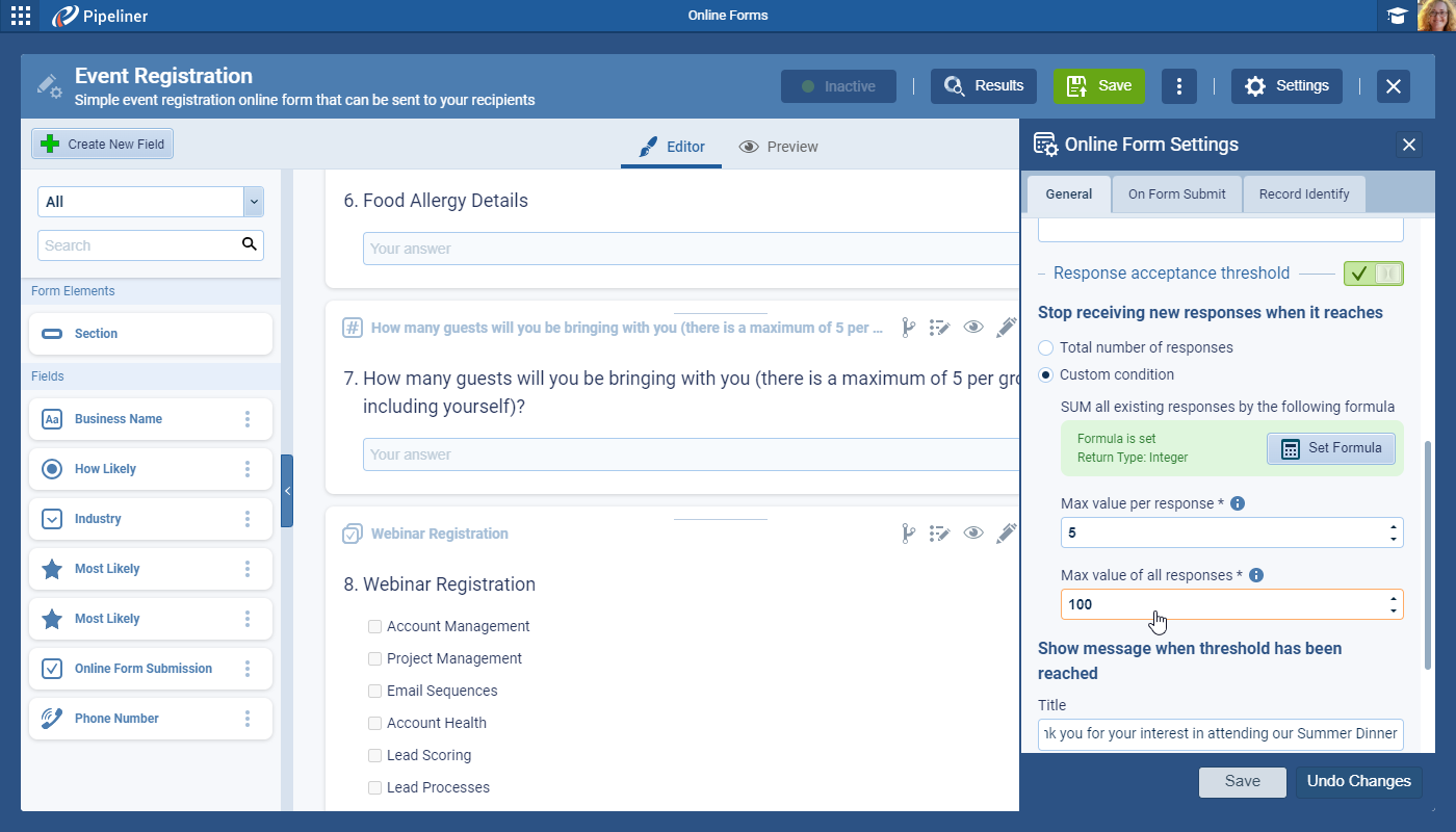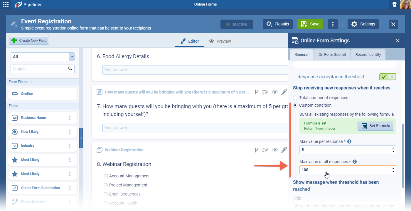 The limit can be set as a “Total Number of Responses” which will auto disable the form after a set number of responses or as a “Custom Condition“. When using Custom Condition, the next step is to “Set Formula” to determine how responses are summed up. The example below sums the submitted response + the number of additional guests submitted by the respondent. ⤵