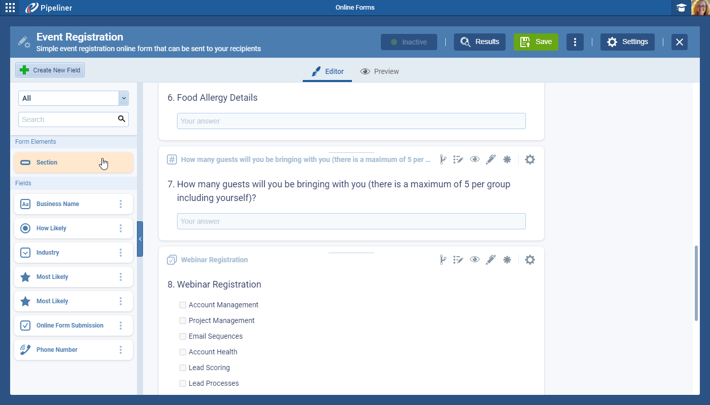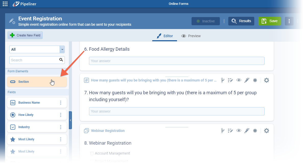 - “Section” has been added as a new element in the online form sidebar. The Section element is customizable when placed on a form.