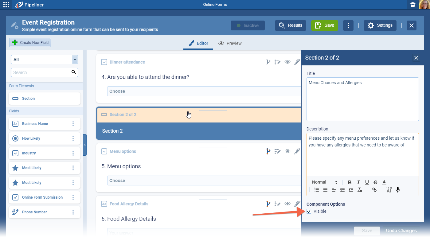 - “Visibility” › defines whether this section element (divider) is shown on the form allowing for more customization — e.g. the user wants to have the form divided into multiple pages but does not want to have some section elements visible on the form.