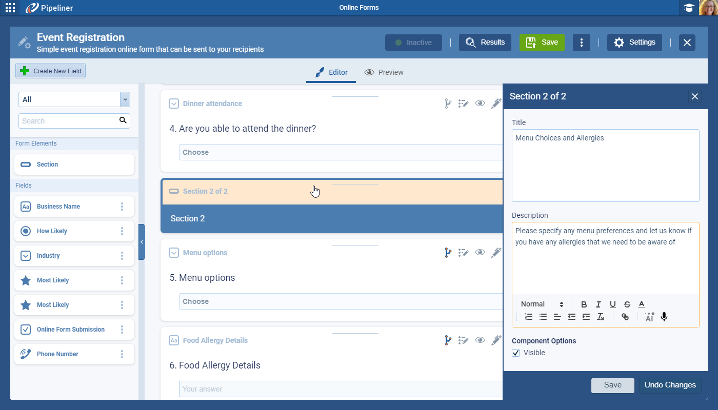 - The user can drag & drop Section elements to the form and then customise the “Title” and “Description“.