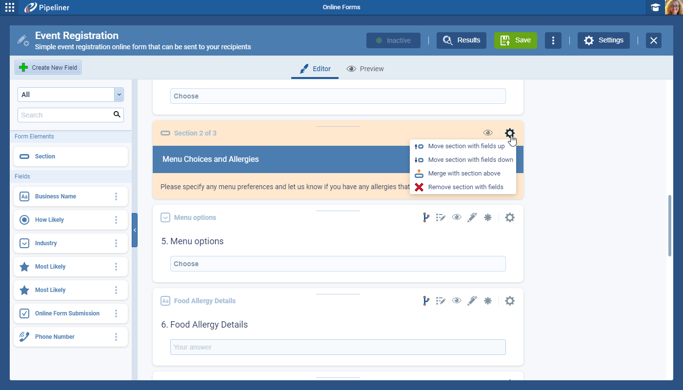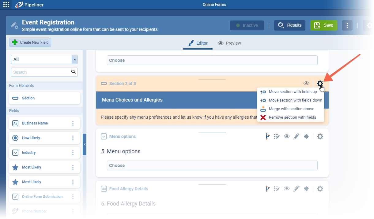 The first section element has also the option to “Delete All” sections from the form with a single click. ⤵