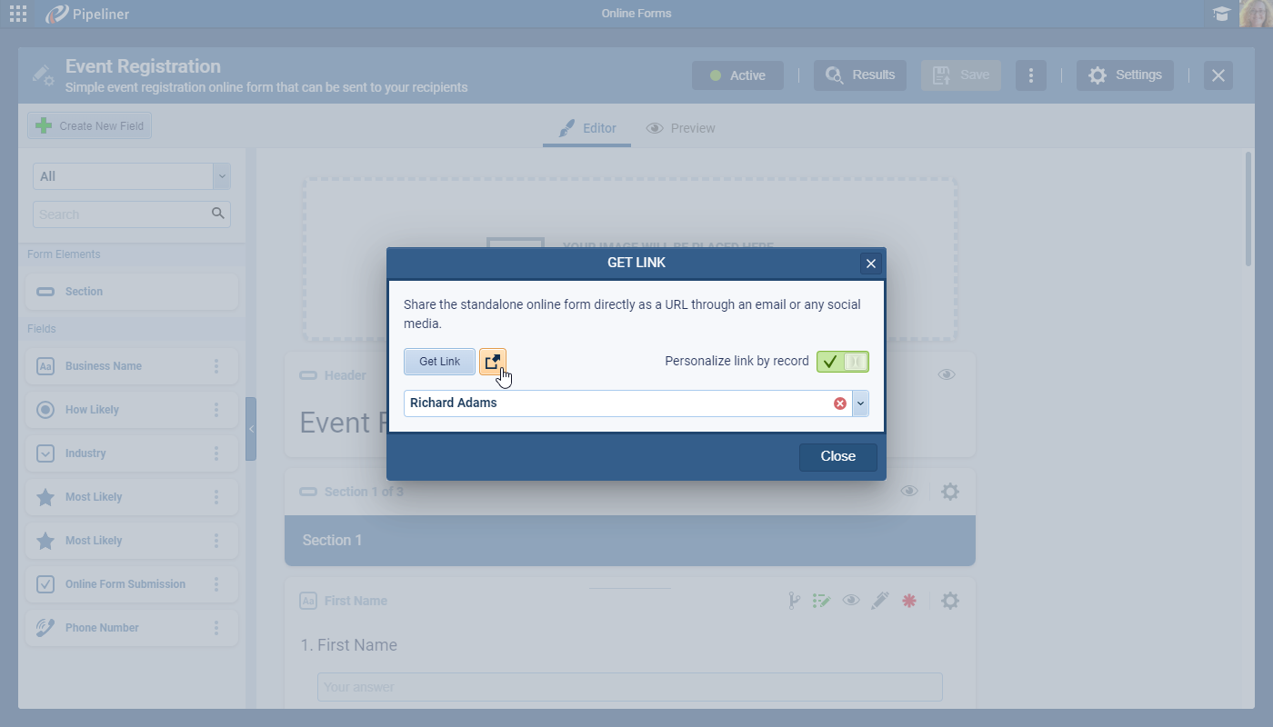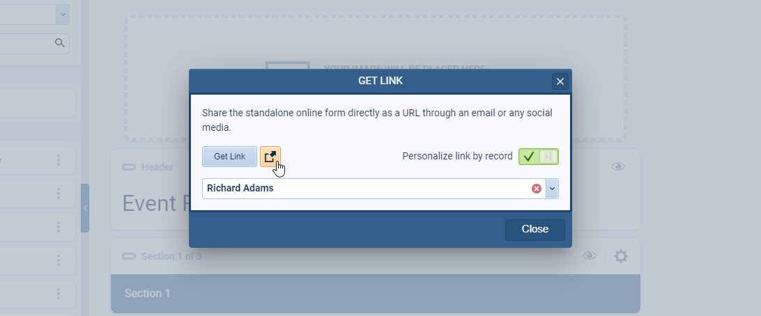 If “Personalize link by record” is enabled and a record is selected, “Get Link” will automatically provide a fully personalized link. ⤵
