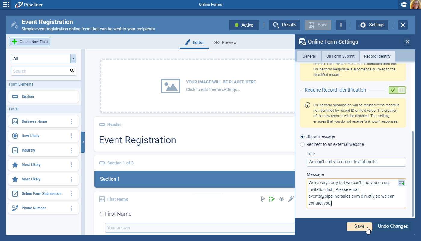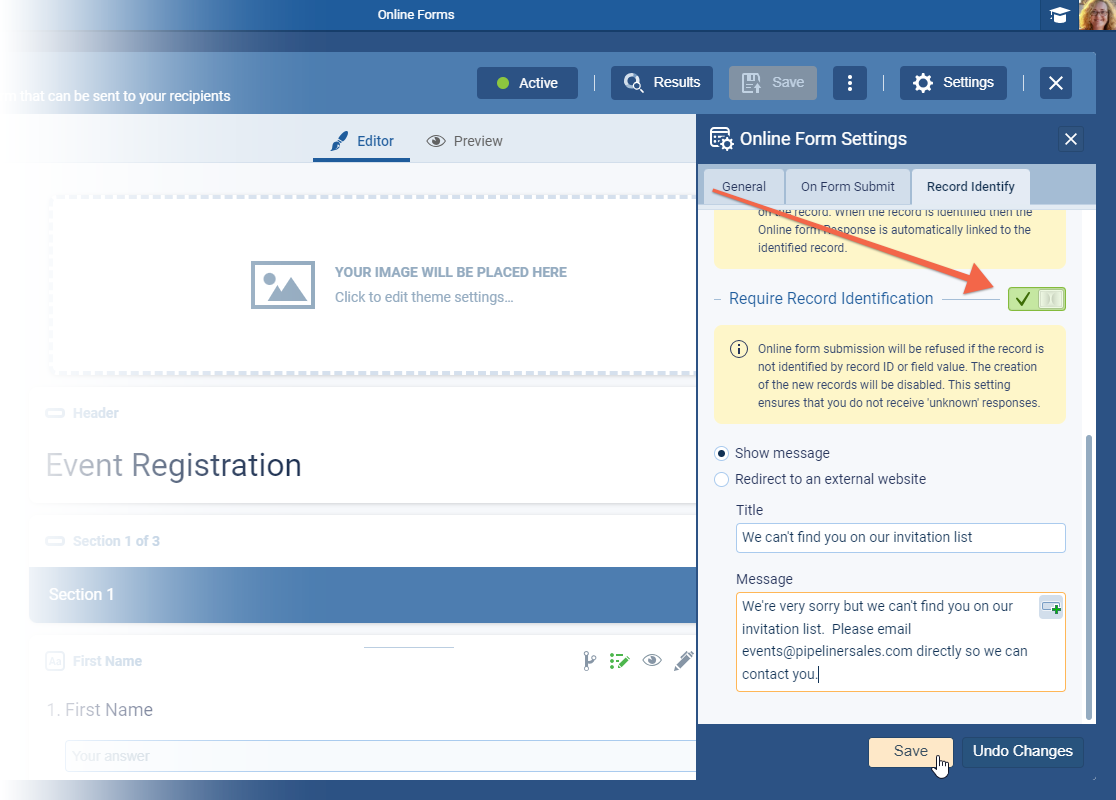 It’s now possible to enable a setting on the online form that does not allow “unknown” responses — i.e. those that cannot be matched to an existing record in Coevera using the record identification criteria you are using. ⤵