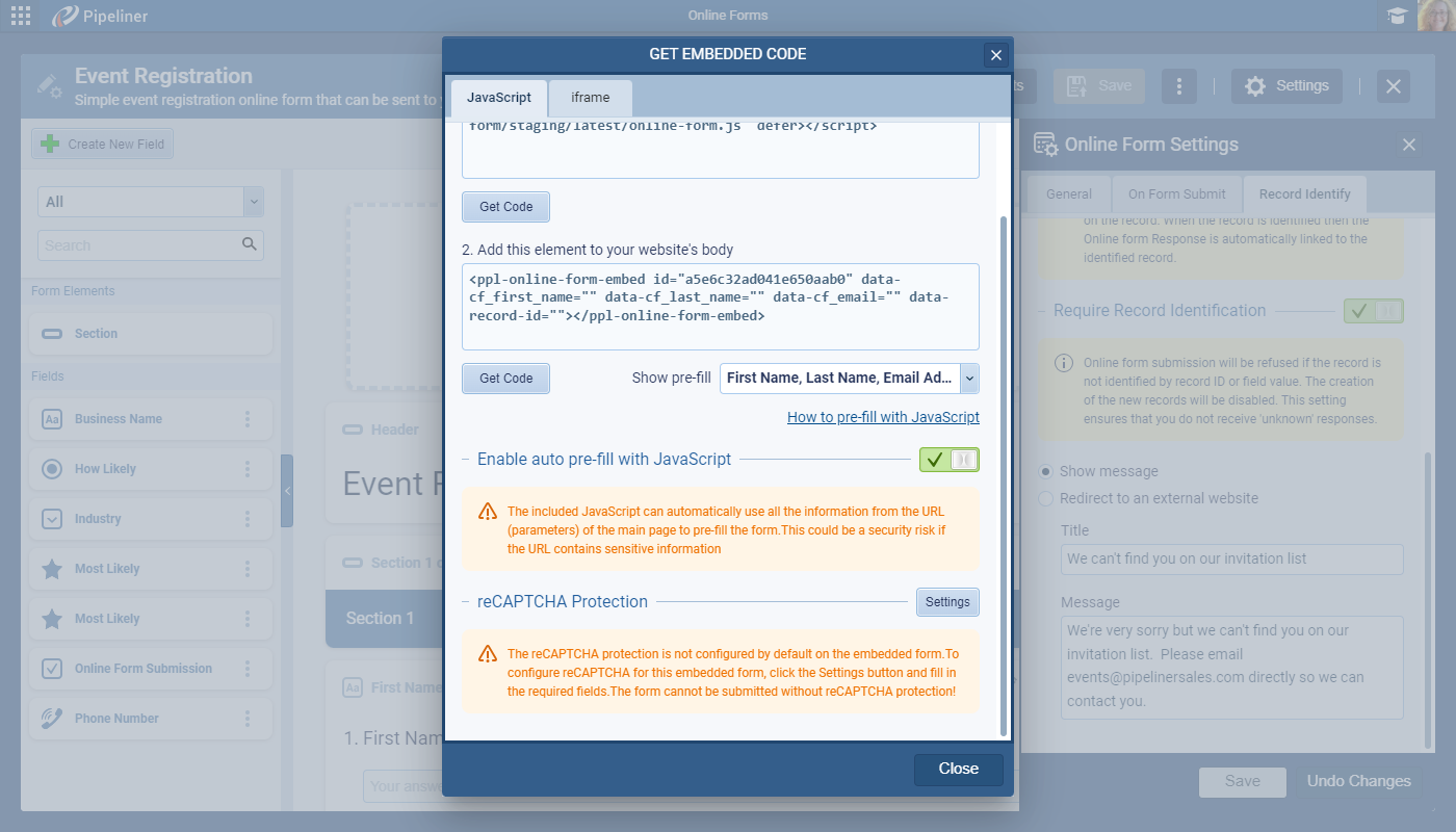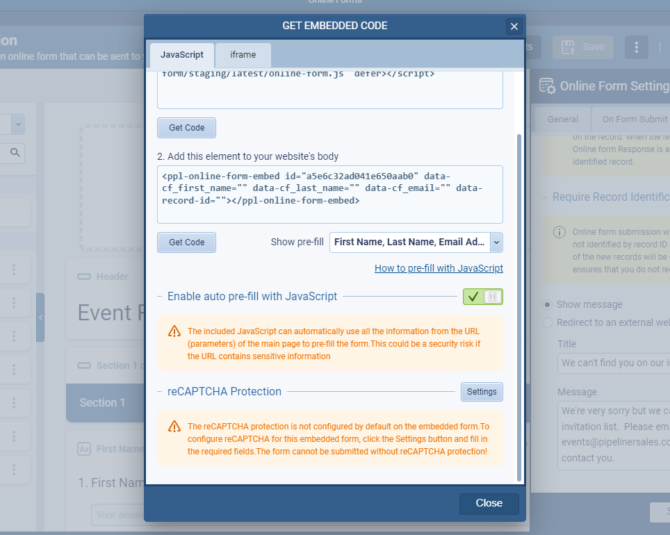 Customers don’t need a web developer to create a standalone page with our embedded online form. Switch on the option to “Enable auto pre-fill with Javascript” to set the embedded form to use URL parameters from the main page (or parent page). We’ve included a simple javascript code that will parse those parameters and use them for pre-filling the form. ⤵