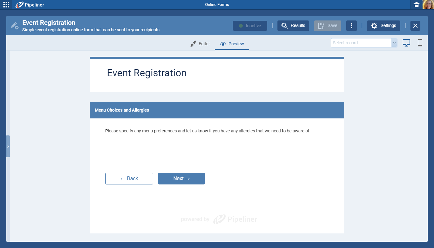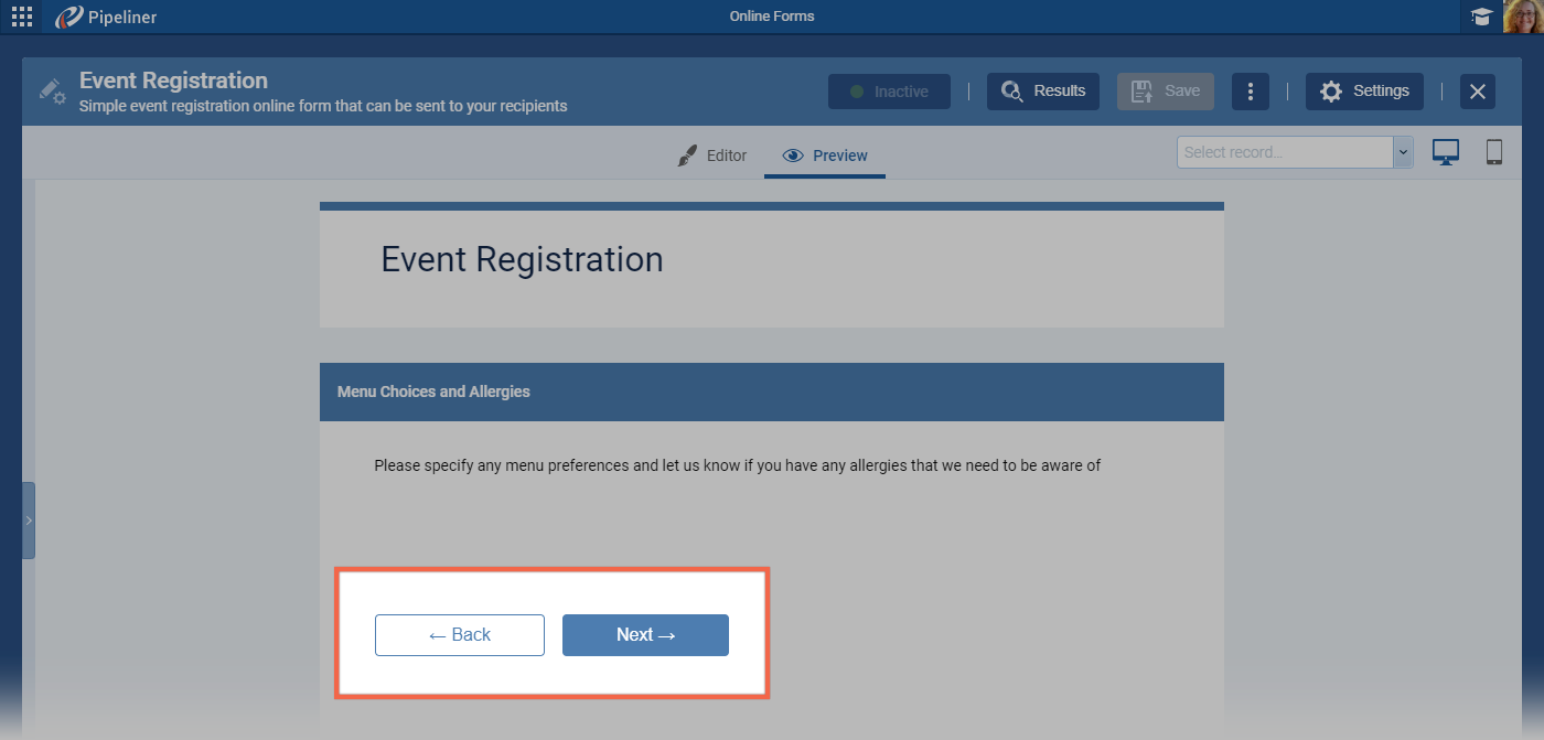 When there are sections included and the form spans multiple pages, the “Next” and “Back” buttons will display. The “Submit” button will display on the final page. ⤵