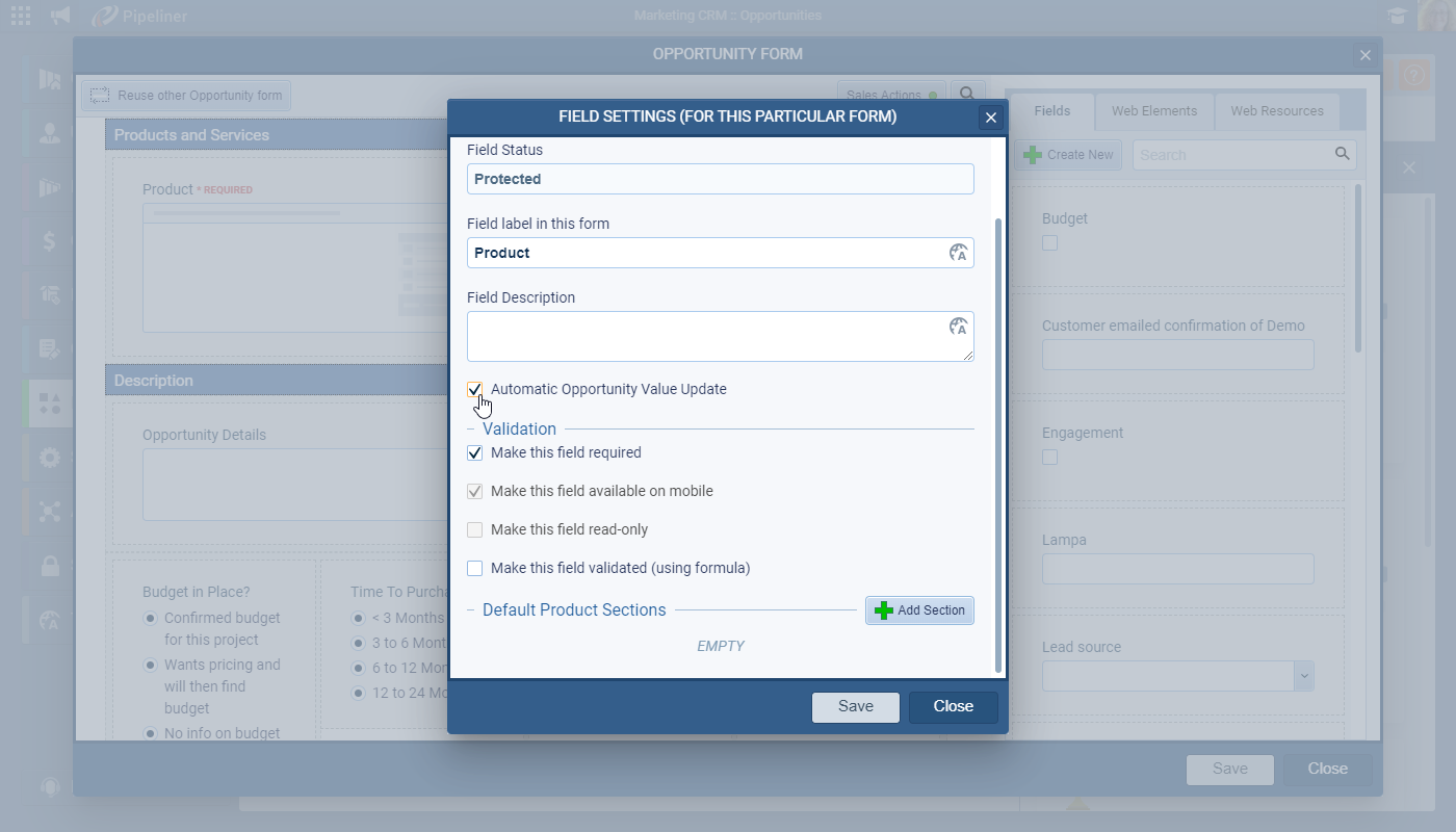 Administrators can enable an option “Automatic Opportunity Value Update” for every Opportunity form, in the “Field Form Setting” for the Products field. ⤵