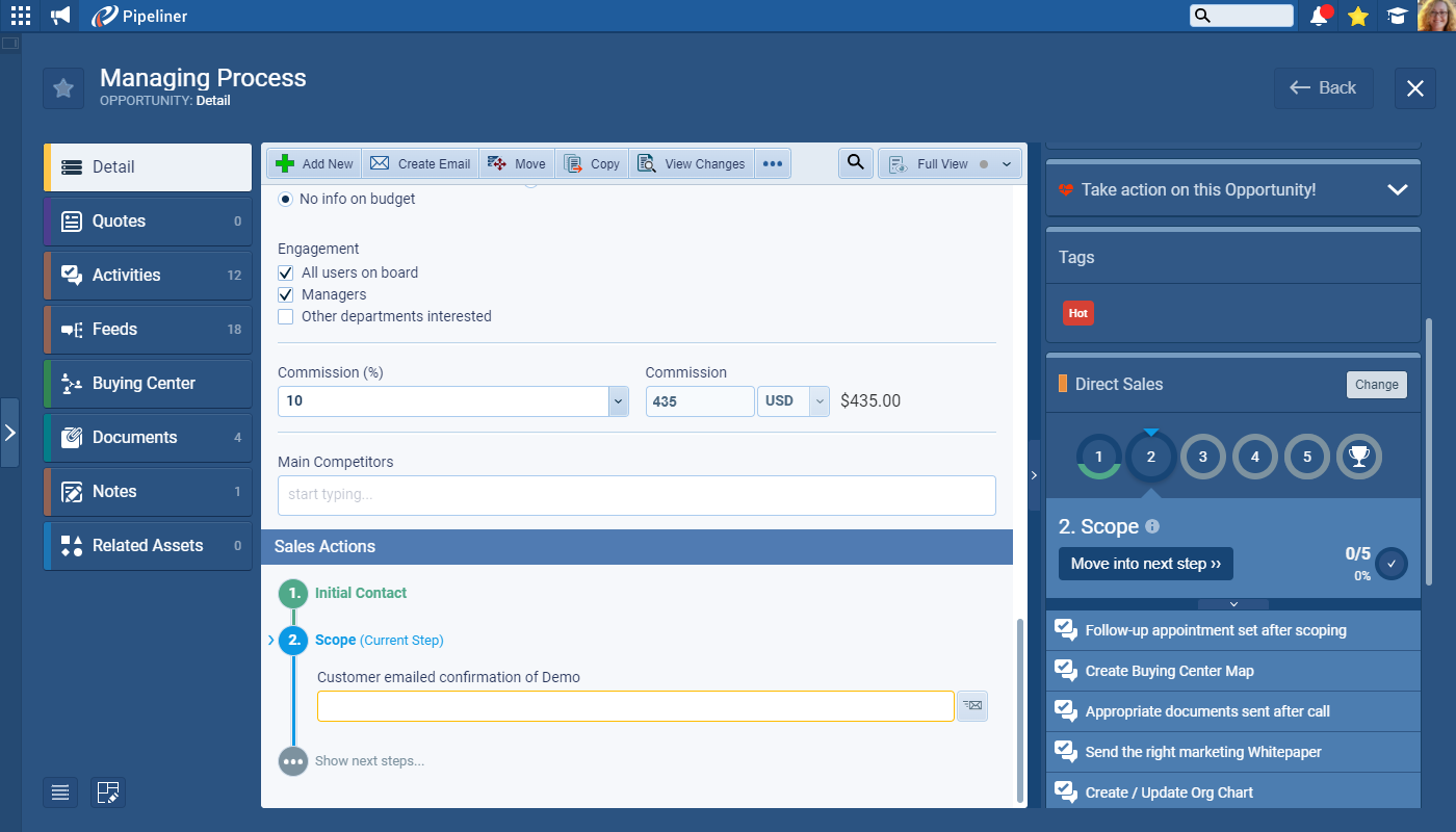 Within an Opportunity, the form step activities & sales actions now use the same color scheme and reflect their respective sales step progress & completion status. ⤵