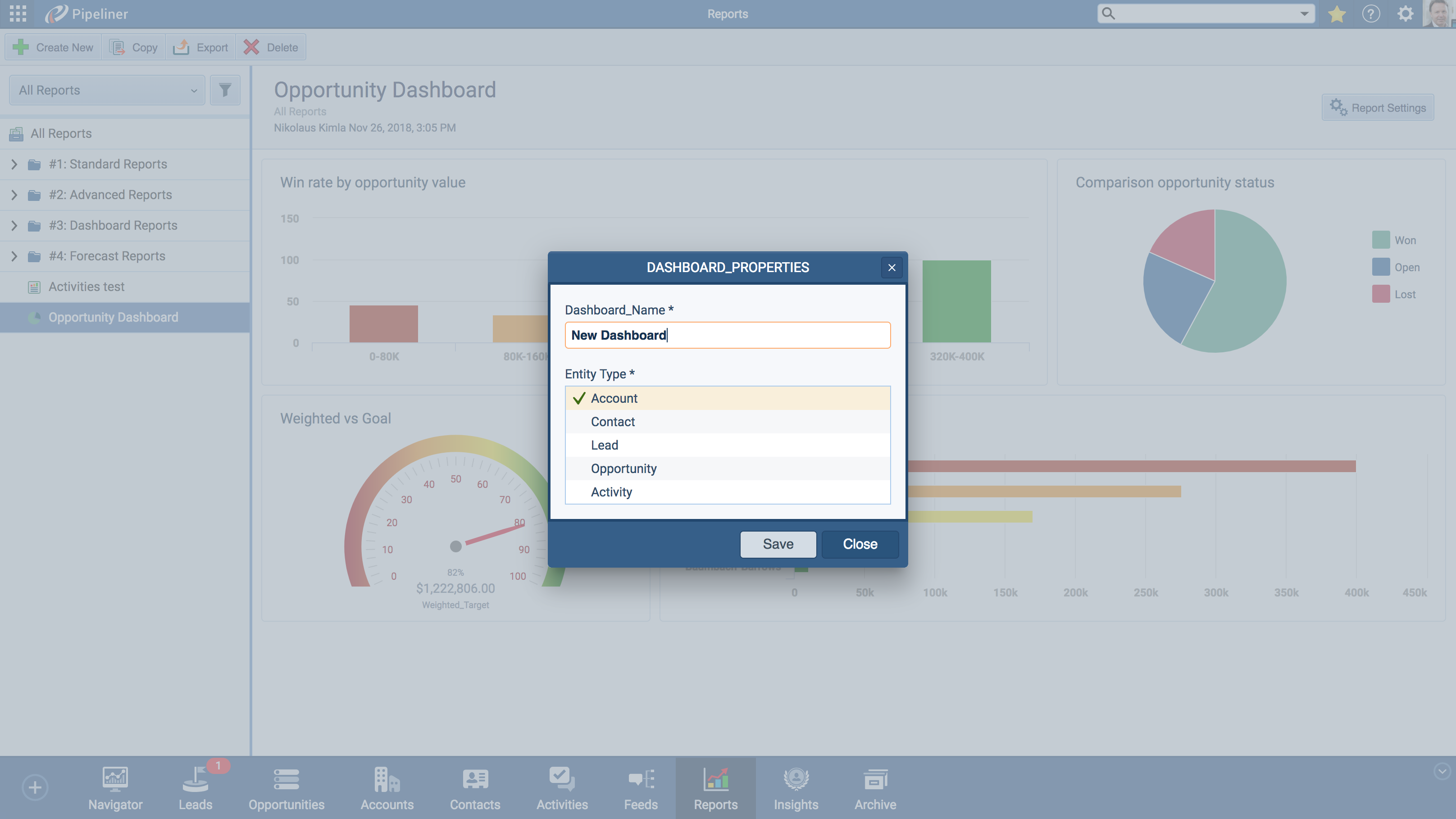 - With this new improvement, you can now create new Dashboard Report from Leads, Opportunities, Accounts, Contacts and Activities. Just click on the “Create New” button in the top panel.