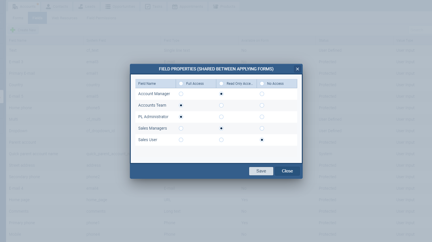 - Create a read-only field per sales role on the form. Some data have informative character and can be modified only by managers; sales reps have only read-only access.