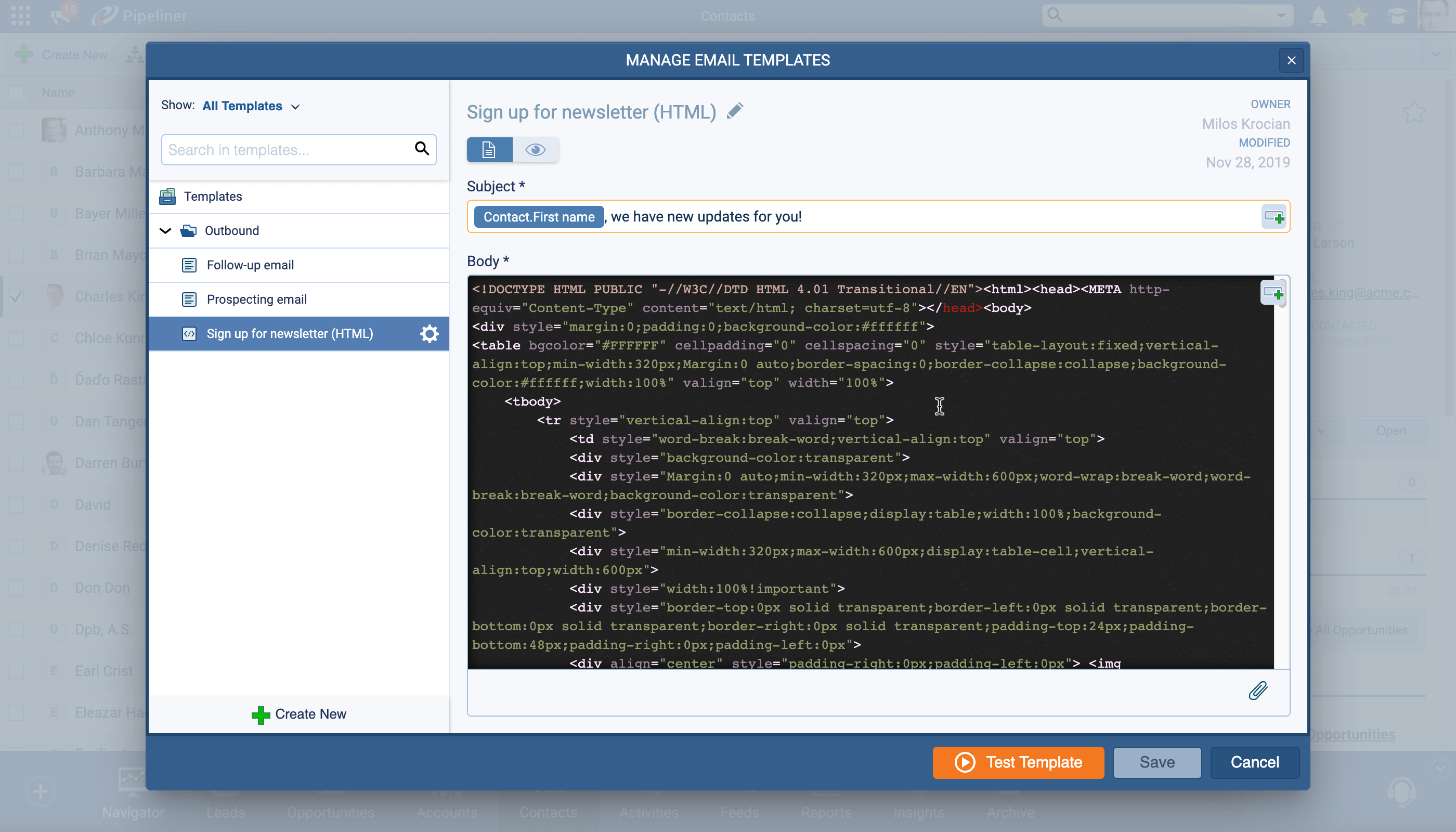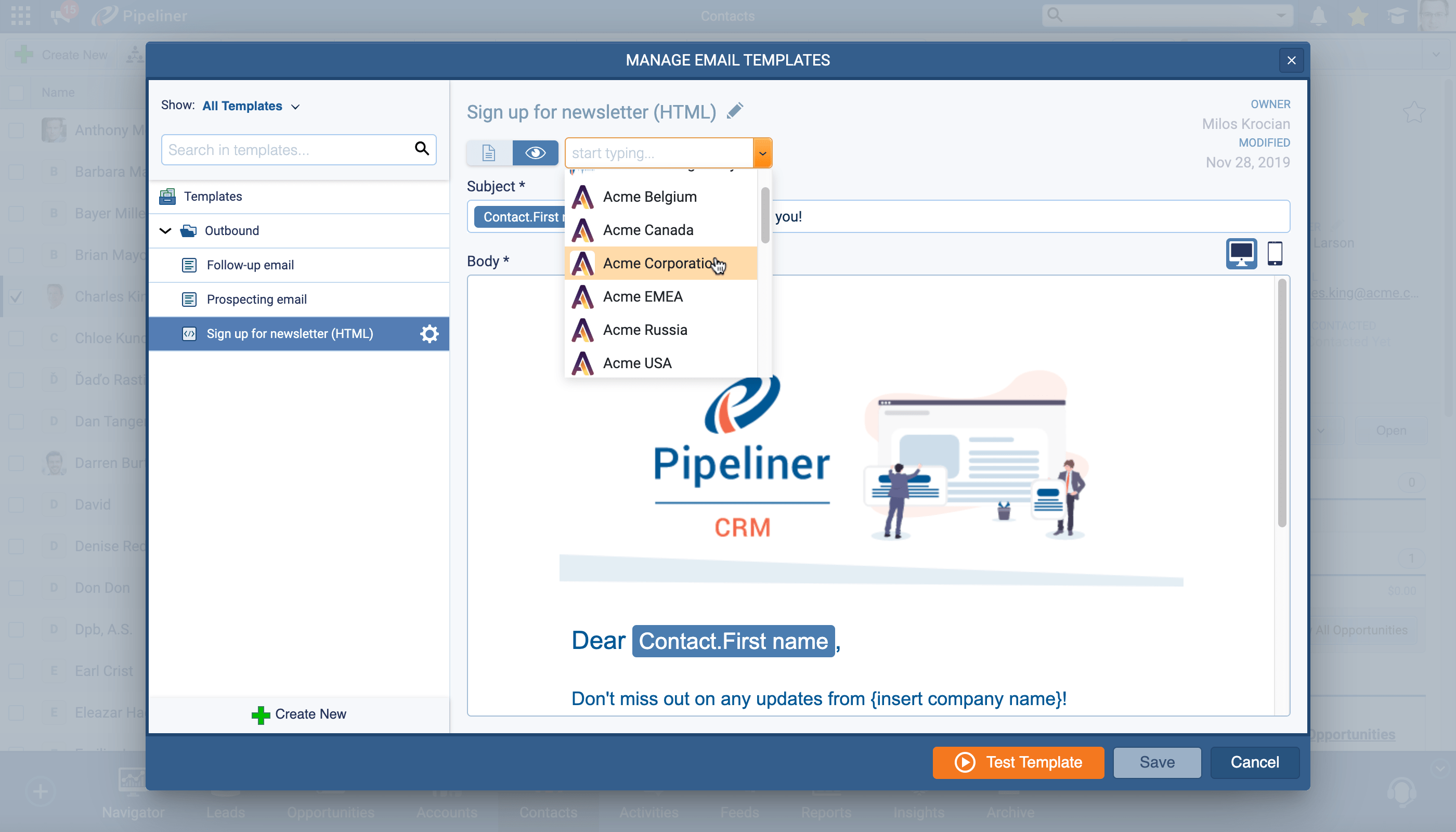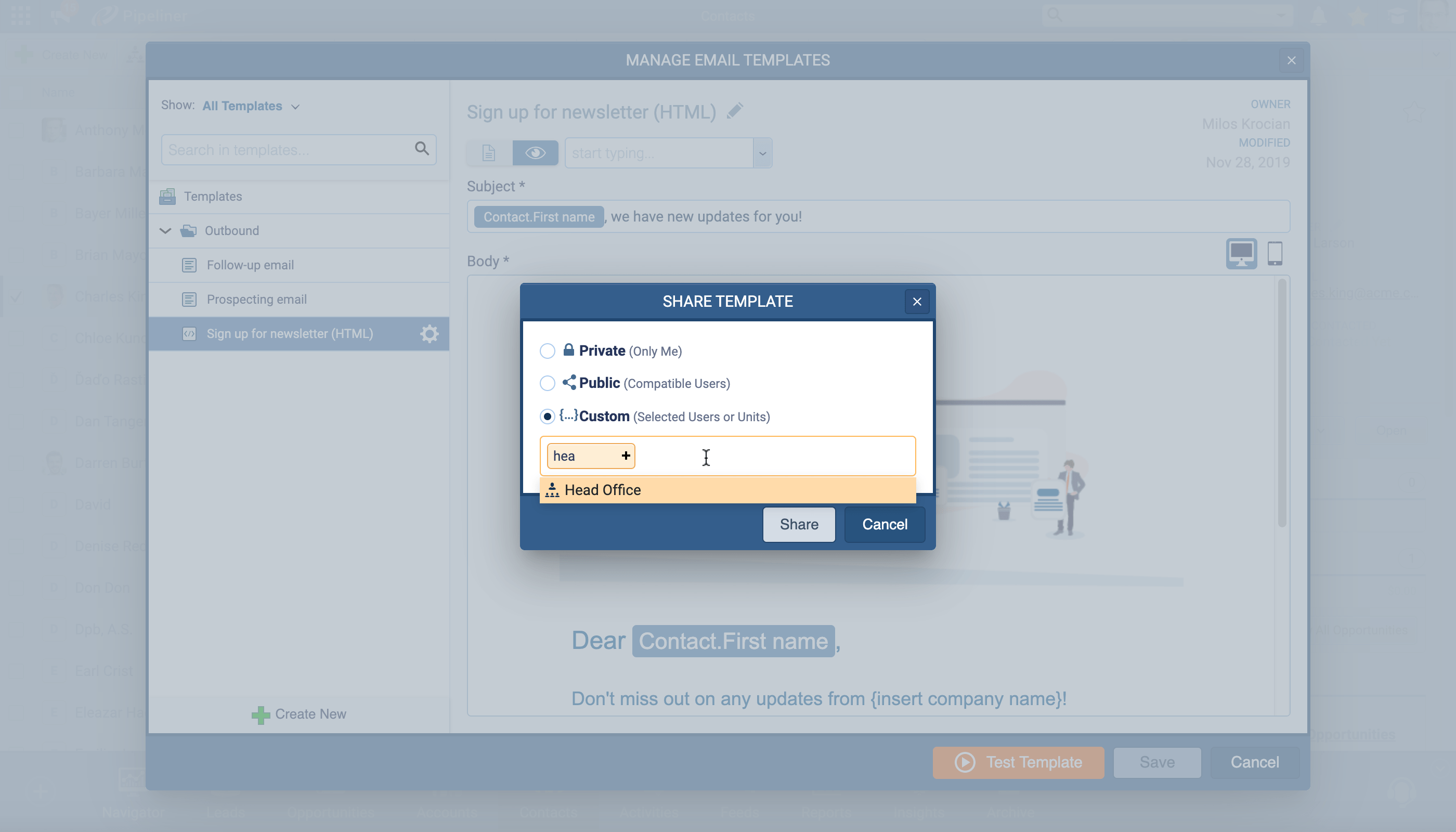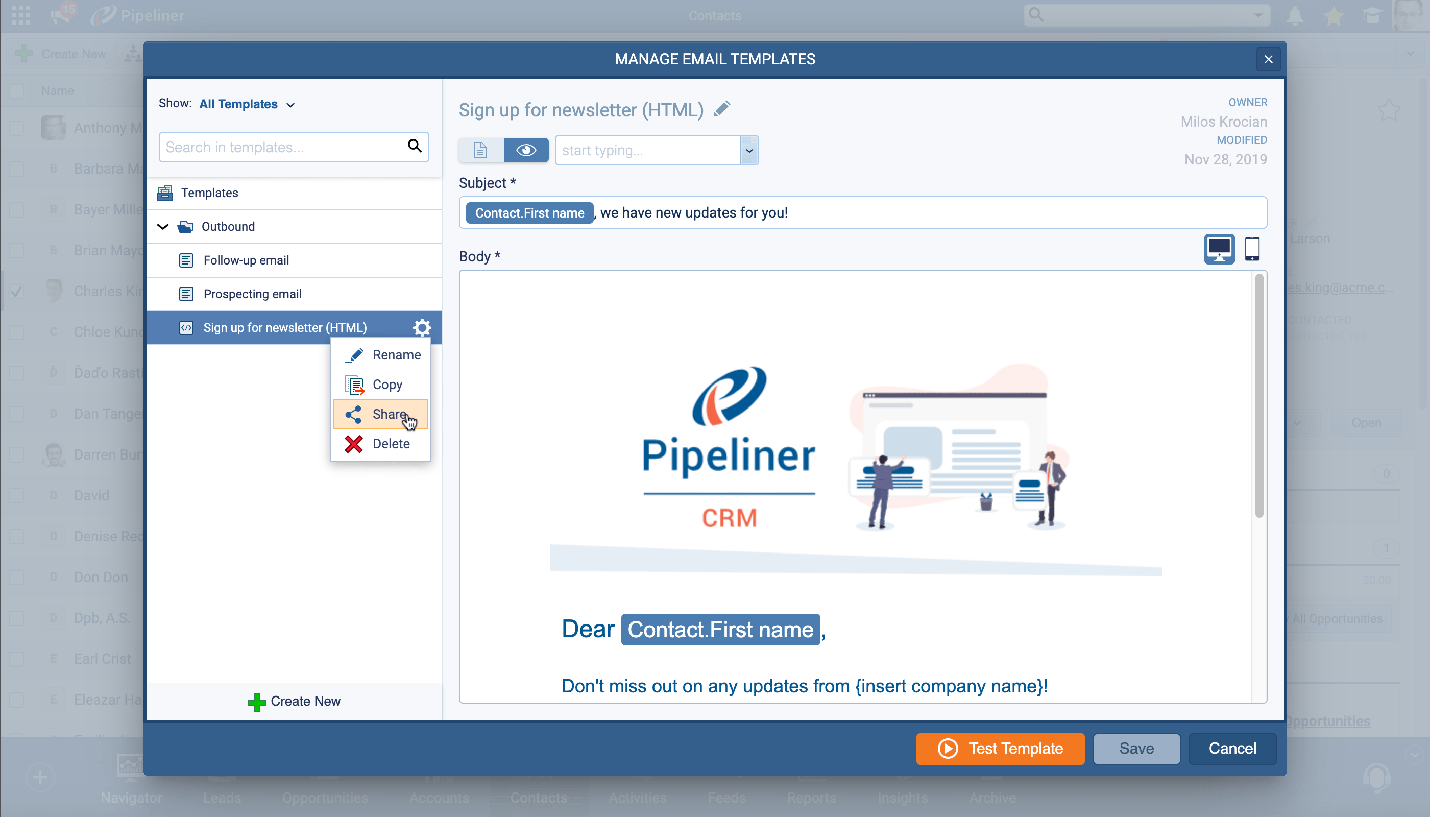 - You can create and share personalized and HTML email templates. These templates can be selected when using the Send Email option for Office 365 and Gmail to send emails to your Contacts.