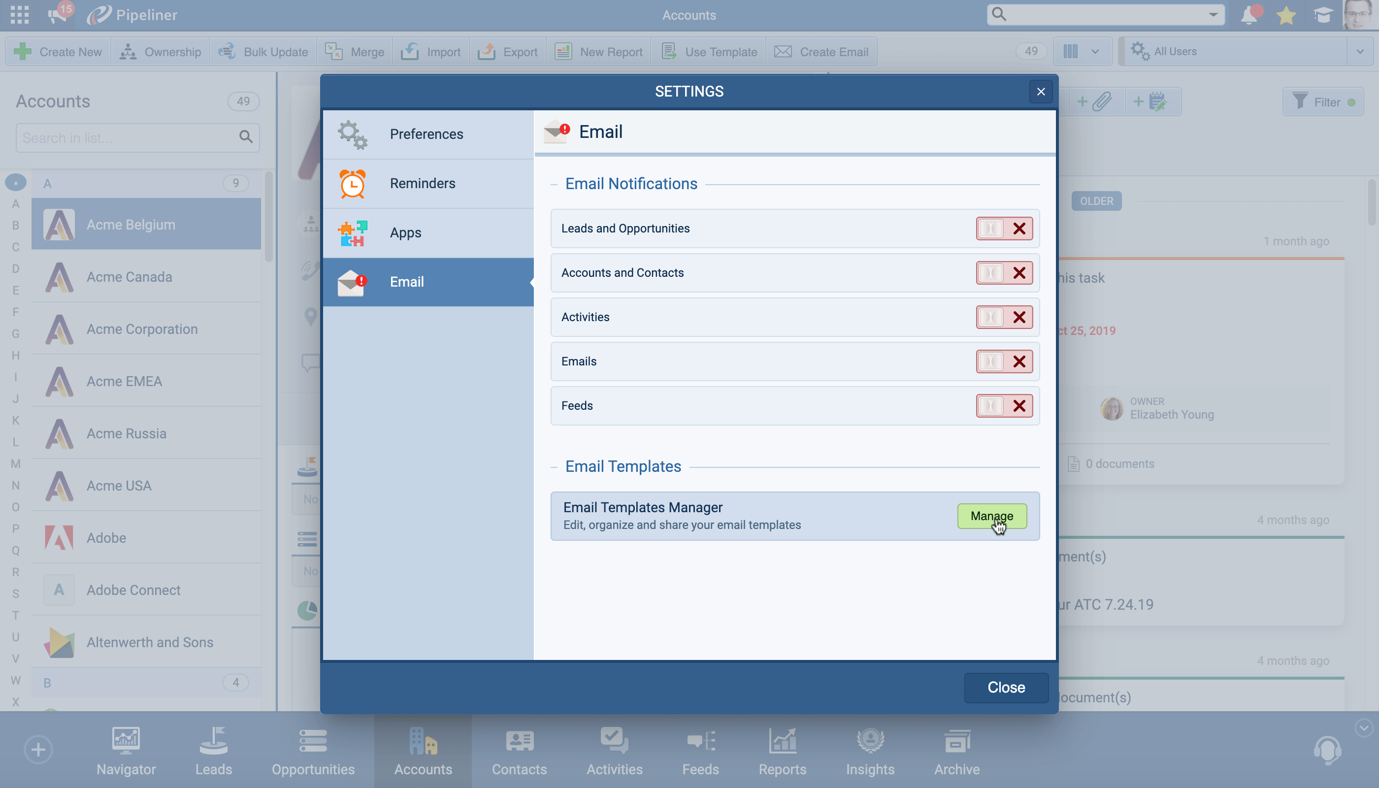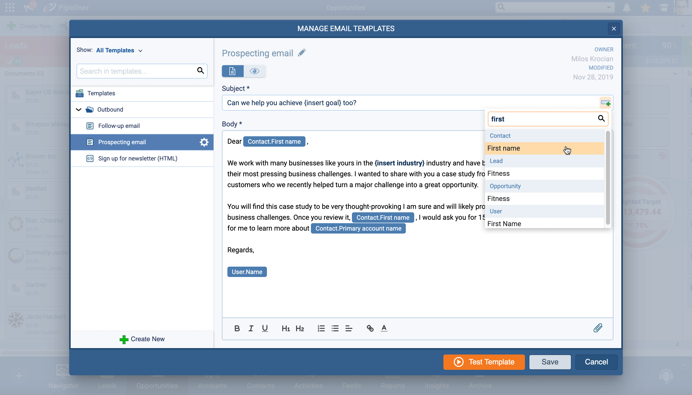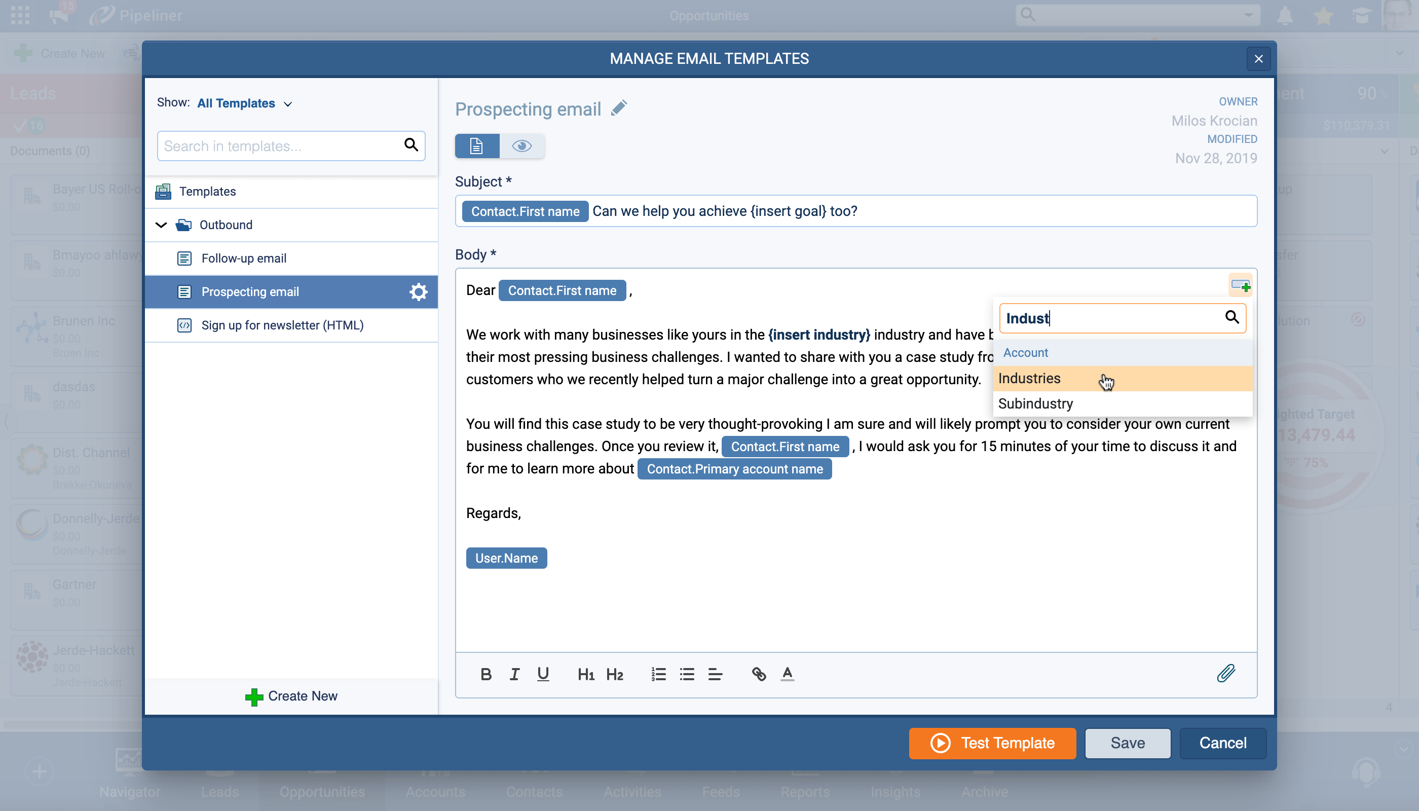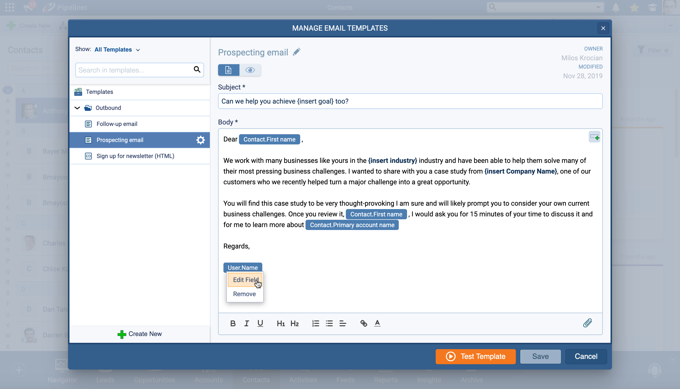 - You can create and share personalized and HTML email templates. These templates can be selected when using the Send Email option for Office 365 and Gmail to send emails to your Contacts.