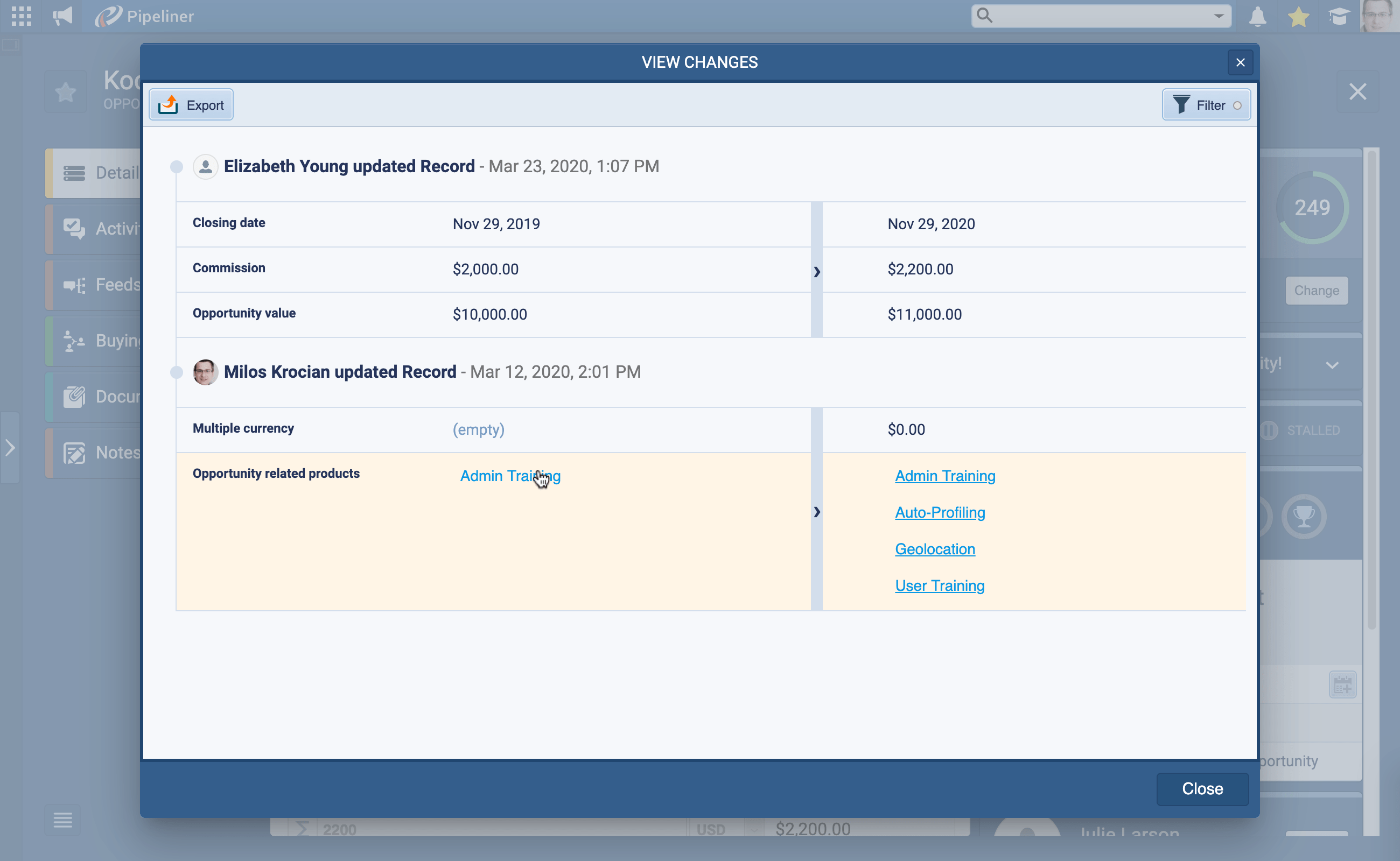 - All changes made to the record will then be displayed and can be exported to an Excel spreadsheet or CSV file (if the user has rights to export dataData Data is a set of quantitative and qualitative facts that can be used as reference or inputs for computations, analyses, descriptions, predictions, reasoning and planning.).