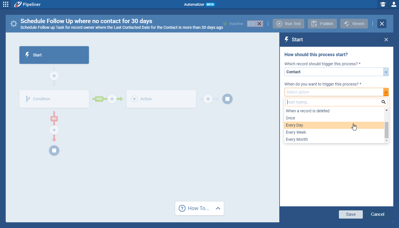 In our first Automatizer release, a userUser User means a person who uses or consumes a product or a service, usually a digital device or an online service. had to physically create or update a record to trigger a process to start. Now, as another major enhancement, we’ve added the ability to schedule a trigger to activate at specified periods: