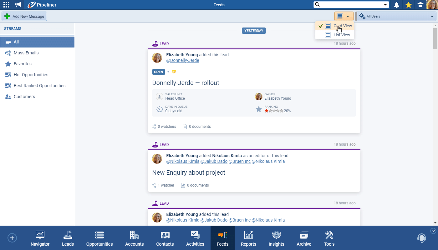 - Brand new List View for Feeds — You are now able to choose to view Feeds in a "List View" when you want to see more items on the screen when viewing Feeds. Select Card View or List View from the dropdown on all Feeds.