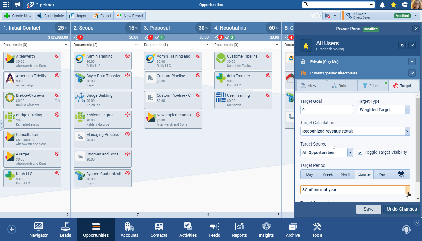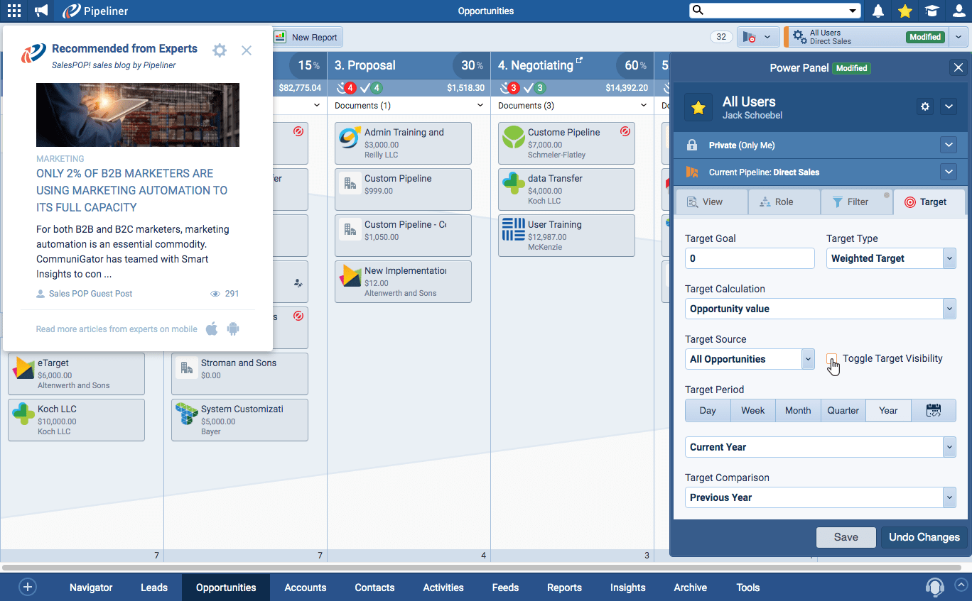 - Hide Target — The “Toggle Target Visibility” addition allows you to choose whether to display the target calculation in front of or behind Won Opportunities. When viewing Opportunities in the PipelinePipeline Sales pipelineis a visual representation of the stage prospects are in the sales process. View, the Target calculation is always displayed over Won Opportunities by default. Now you have an option under Target in the Power Panel to turn this feature off. If you uncheck the Toggle Target Visibility, the Target calculation now will be hidden behind your Won Opportunities.