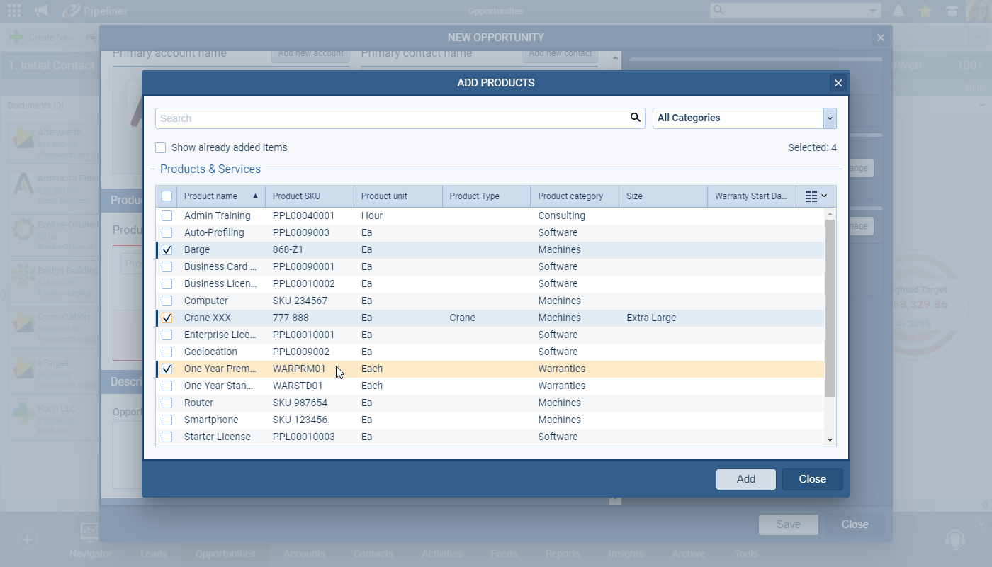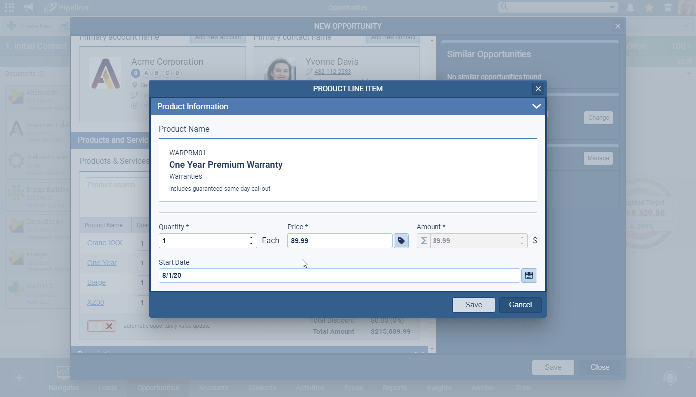 In another major enhancement to Coevera, we have added the ability to add information to an Opportunity’s Products “on the fly” using custom fields. You can now, for example, add your warranty to an Opportunity and select the start date or add your machine model and then pick the colour!