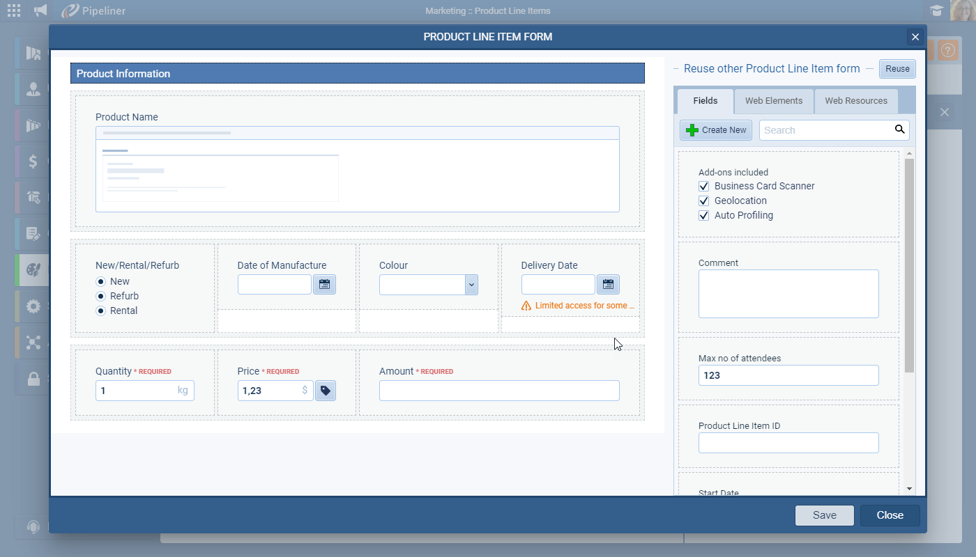 Product Line Items are a new entity. From Fields & Forms in the Admin Module, Administrators for our Enterprise customers will be able to build product-specific forms, add custom fields to them and manage fields permissions.