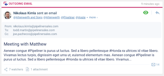 From this 3.7 release forward, emails captured by the email integration(s) will be combined into conversations to allow users to keep a better track of their email threads. This will also allow Reply Status to be tracked and you’ll see the number of replies in the bottom right-hand corner of the Feed item.