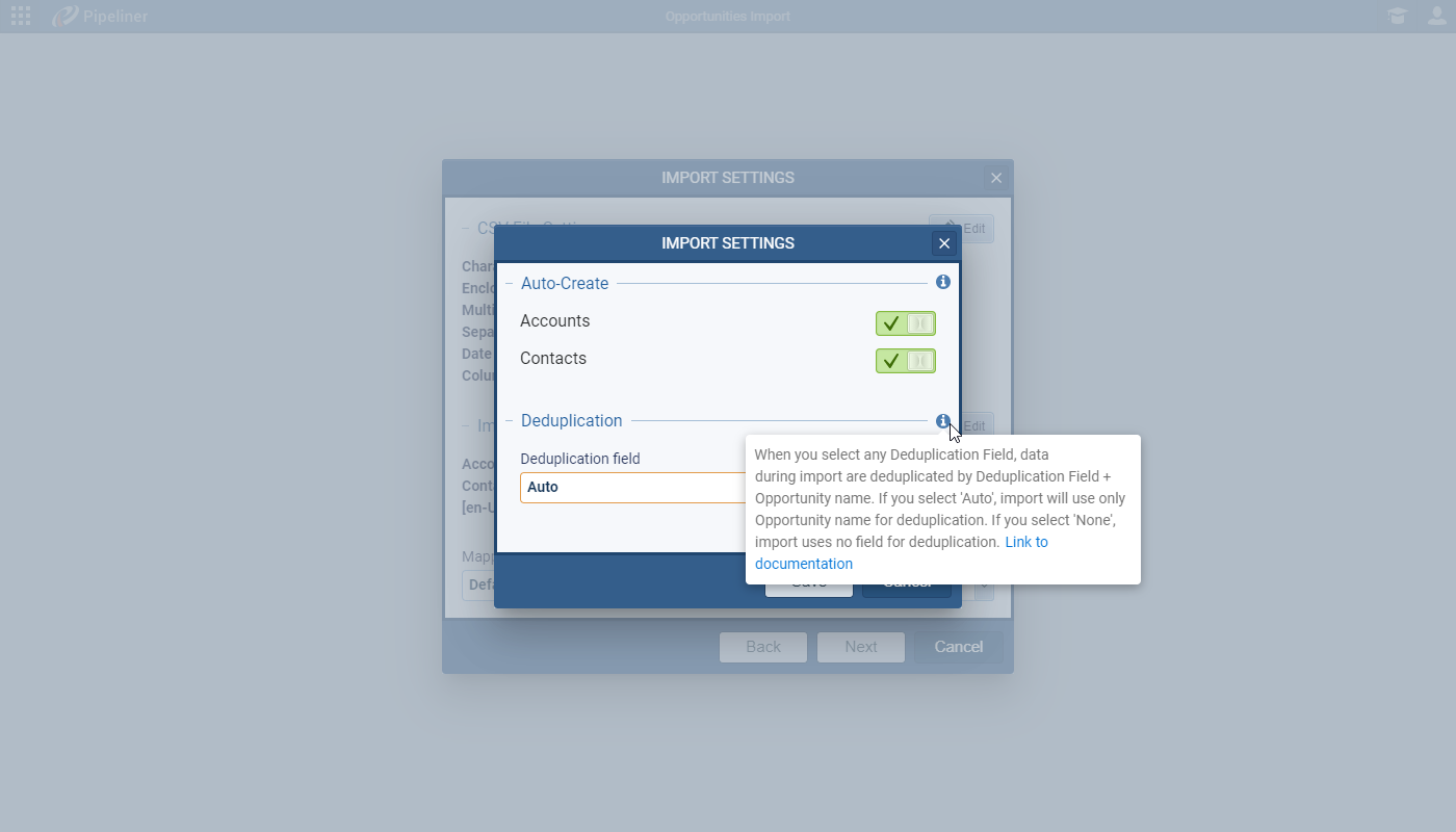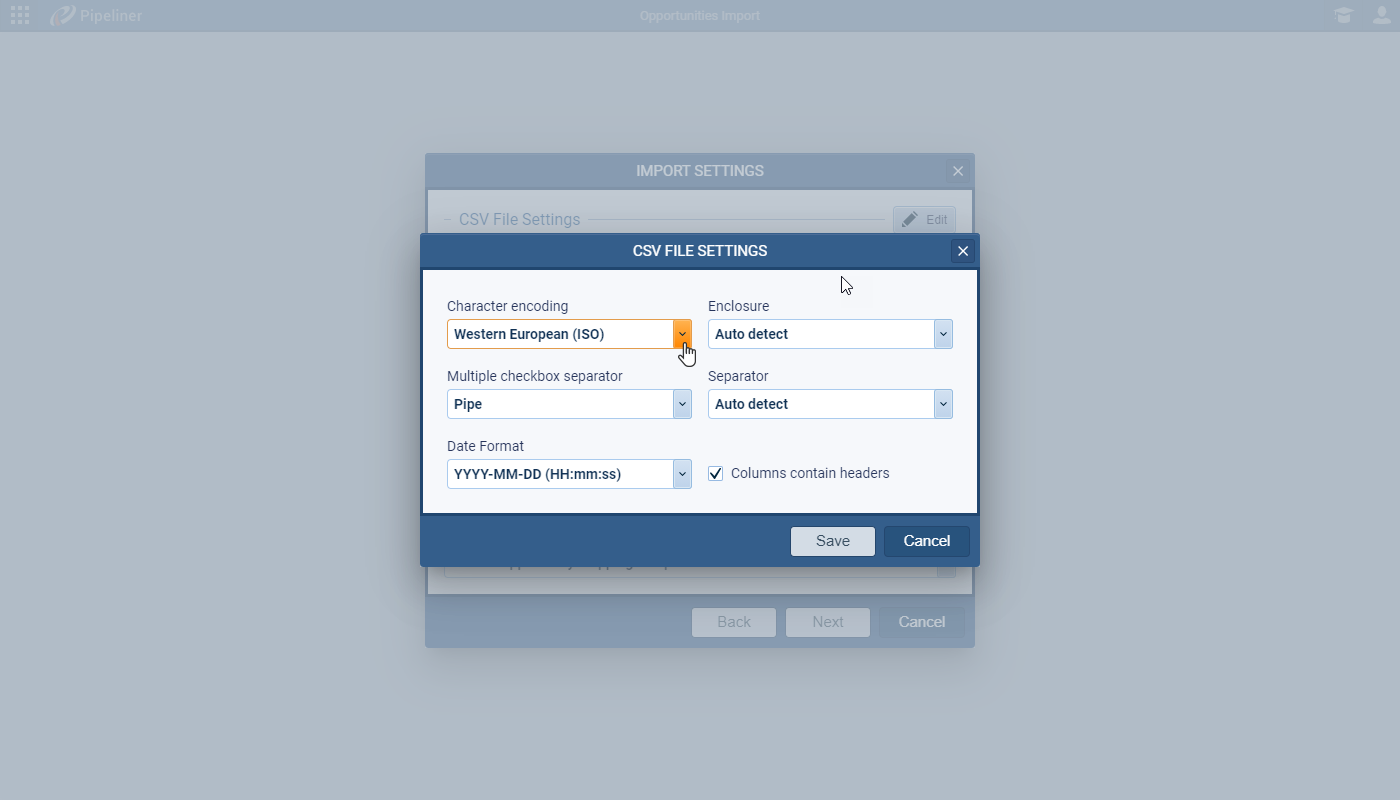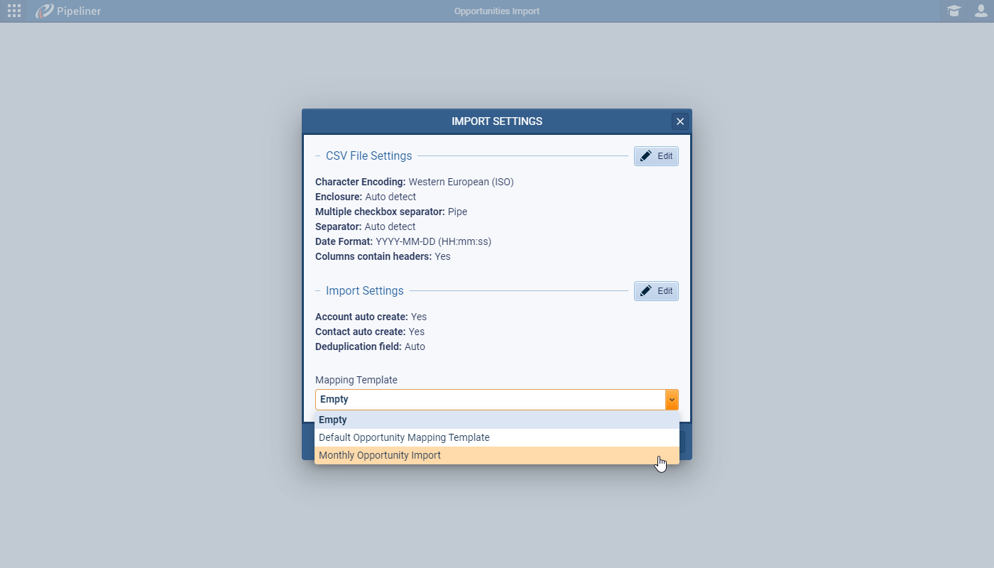Users who are regularly importing dataData Data is a set of quantitative and qualitative facts that can be used as reference or inputs for computations, analyses, descriptions, predictions, reasoning and planning. can now save their import settings as a TemplateTemplate Template is a generic file with a framework showing the standard sections or features of a specific kind of document, used to create a new document of the same type faster and easier. that can be reused each time when importing data from the same source. You can save the CSV File Settings — encoding, date format, that the file contains a header row etc. — as well as Import Settings — preferences including which field to use to group or de-duplicate the incoming data as well as whether to auto-create related records.