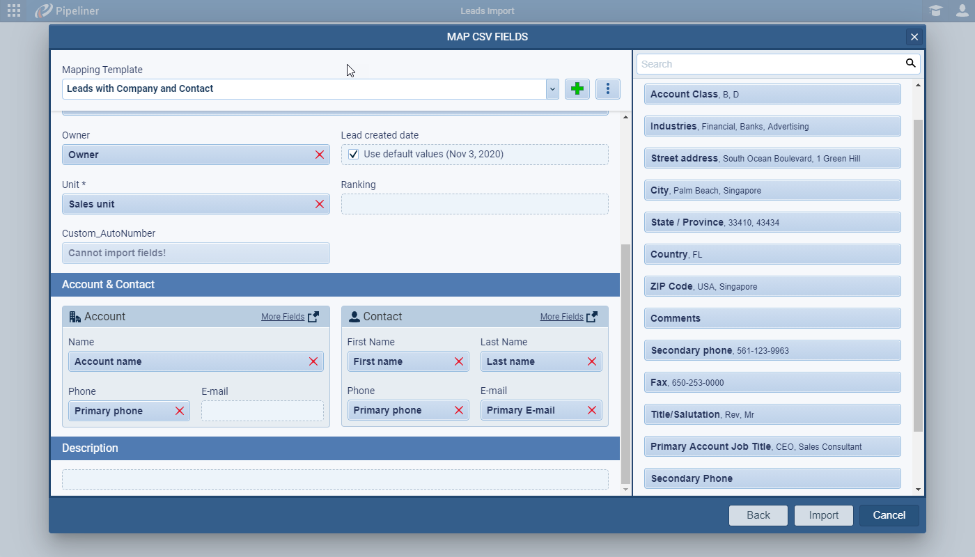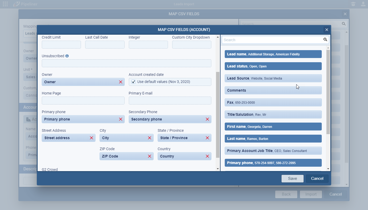 Use the More Fields option on the Field Mappings screen to map website, address, more phone numbers, contact job title etc. You can map fields more than once — so you just need a single column for Owner, for example, and can map it to an AccountAccount Account refers to a record of primary and background information about an individual or corporate customer, including contact data, preferred services, and transactions with your company. and a Contact and a LeadLead Lead refers to a prospect or potential customer (who can be an individual or organization) that exhibits interest in your service or product; or any additional information about such entity. or you could map the same address fields to both an Account and a Contact.