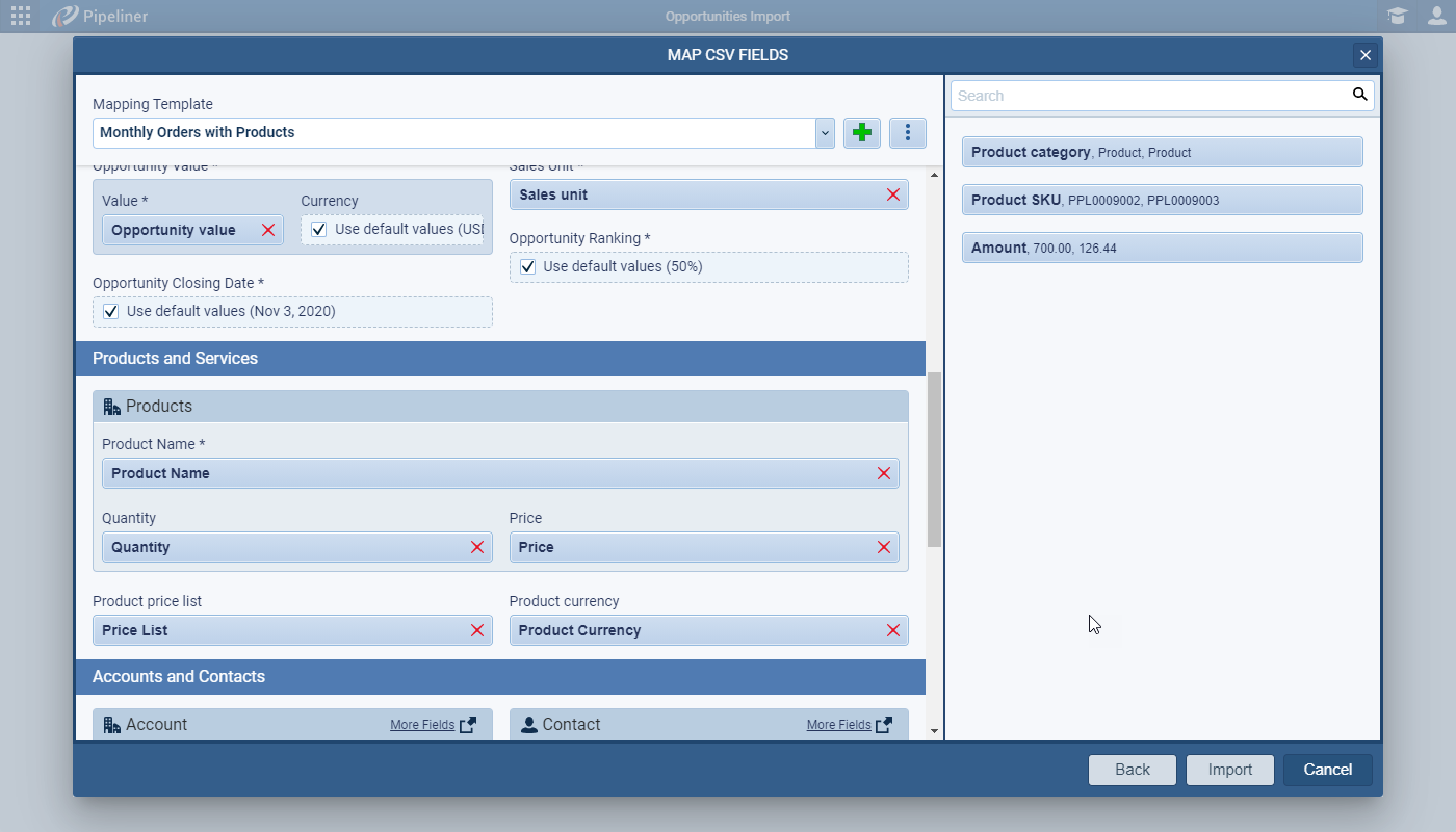 Your import CSV file will need to be prepared following the template format exactly with each Product Line Item on a separate row. You can select the field that identifies the Opportunity that the Products should be added to in the Import Settings option under the “Grouped by” field. For example, if your file contains a row per Product and each row has an identical Opportunity name, you would group by Opportunity name to avoid creating duplicate opportunities and to ensure all products are added to the same opportunity.