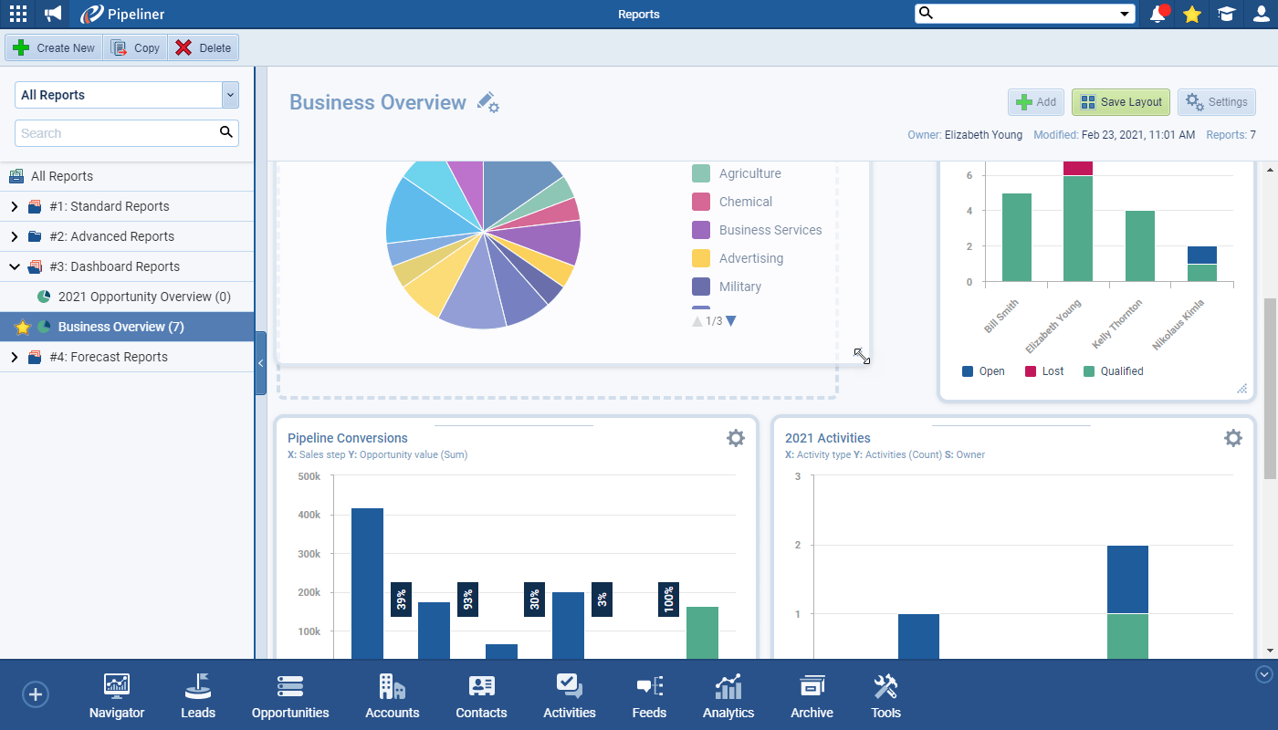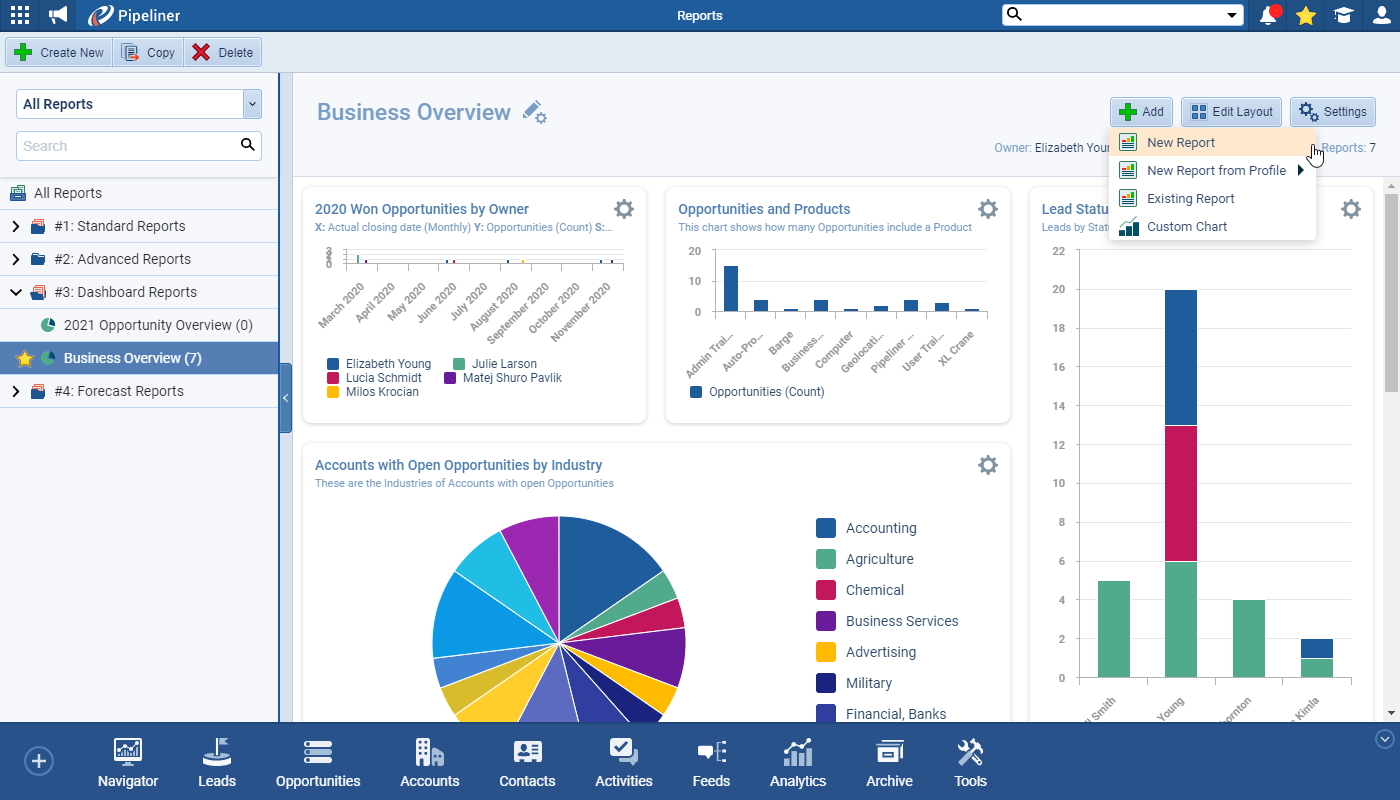 You can add Report Charts to a Dashboard using the “Add to Dashboard” option or create a new Report from a Dashboard. Note the new option to create a New Report based on an existing Saved Profile. Dashboard layouts can be edited and charts resized to create just the right view.