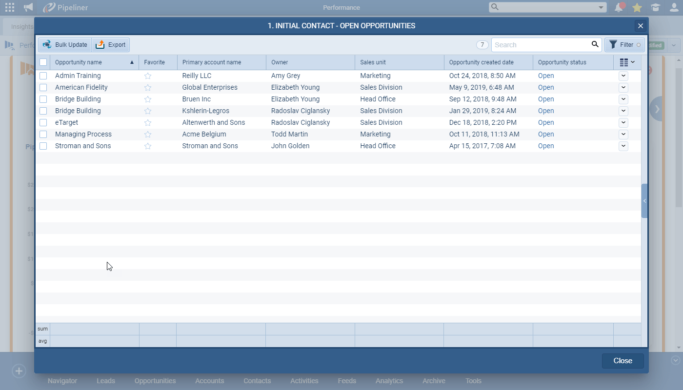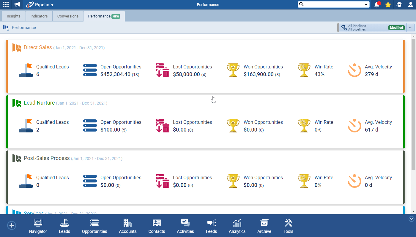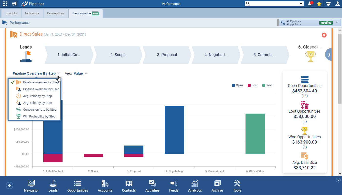 The Performance tab gives you deep and intuitive feedback on the health and performance of each of your Pipelines. Click on a pipelinePipeline Sales pipelineis a visual representation of the stage prospects are in the sales process. to drill into deeper Insights, reviewing performance by sales step or by userUser User means a person who uses or consumes a product or a service, usually a digital device or an online service.. You can view the overall pipeline health showing Open vs Lost Opportunities by step or by user, Velocity by step or by user, ConversionConversion Conversion is the process of turning a target consumer into a paying customer; or more generally, the point at which a user performs a specific action favorable to a marketer or a seller. Rates or Win Percentages by Step and can choose from counts or values.