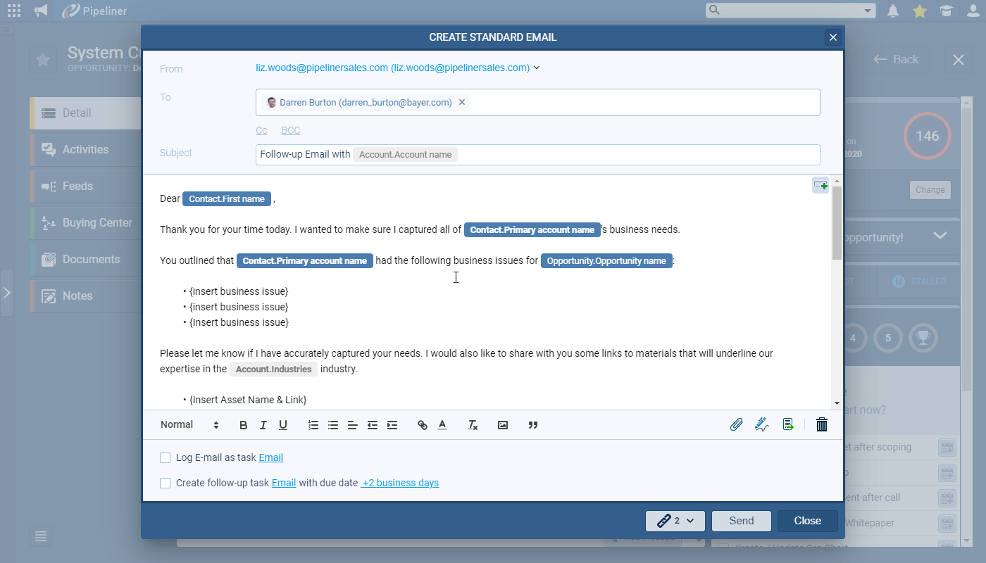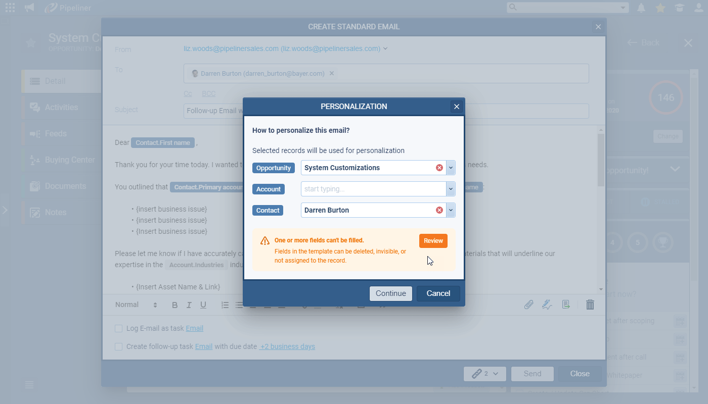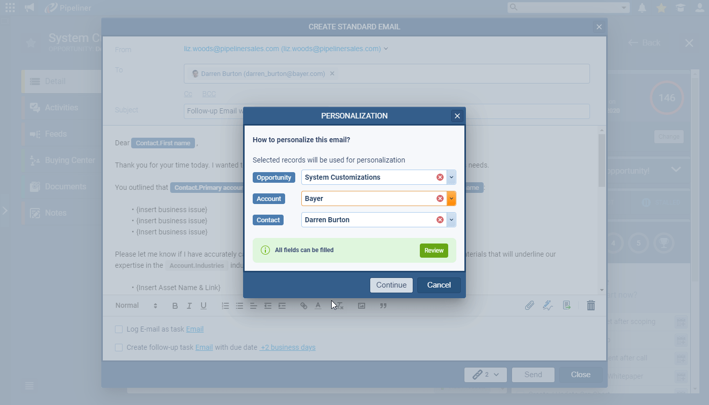 We’ve made email personalization smarter and easier to manage. When you send an email from an Opportunity, for example, we’ll automatically preselect the details for the Primary Contact. When using a templateTemplate Template is a generic file with a framework showing the standard sections or features of a specific kind of document, used to create a new document of the same type faster and easier., any field that cannot be filled with personalized information will be highlighted in grey so you can easily identify them. When you click Send, you’ll be able to see exactly which records will be used for personalizing your email.