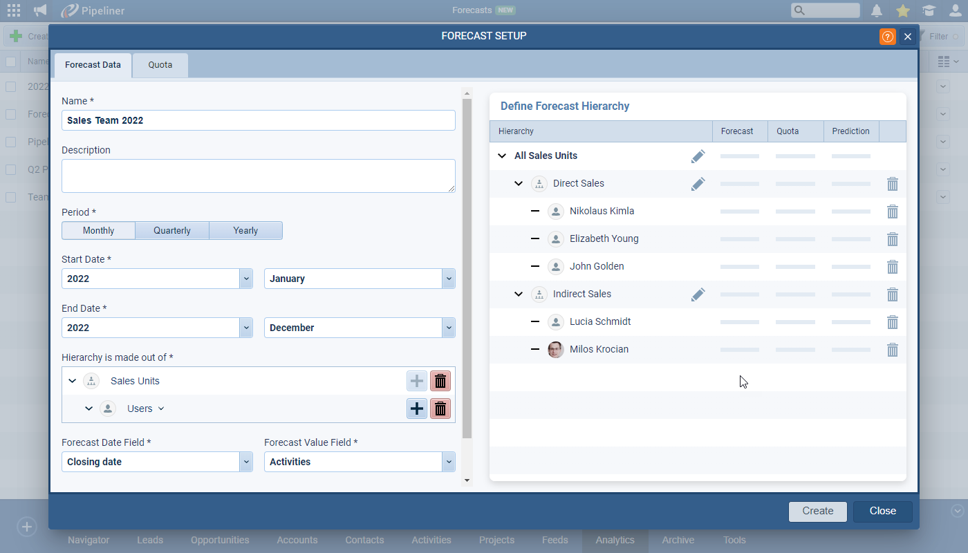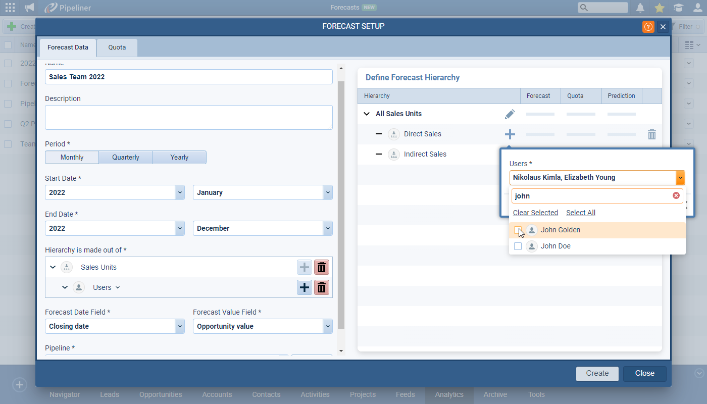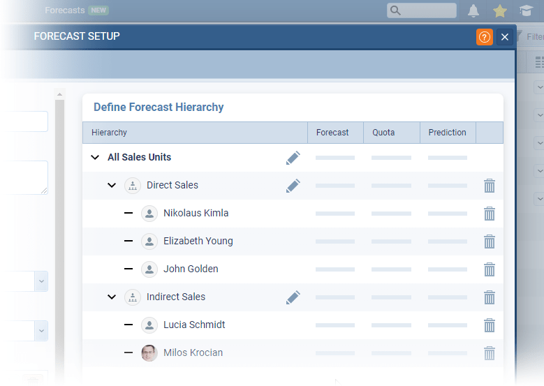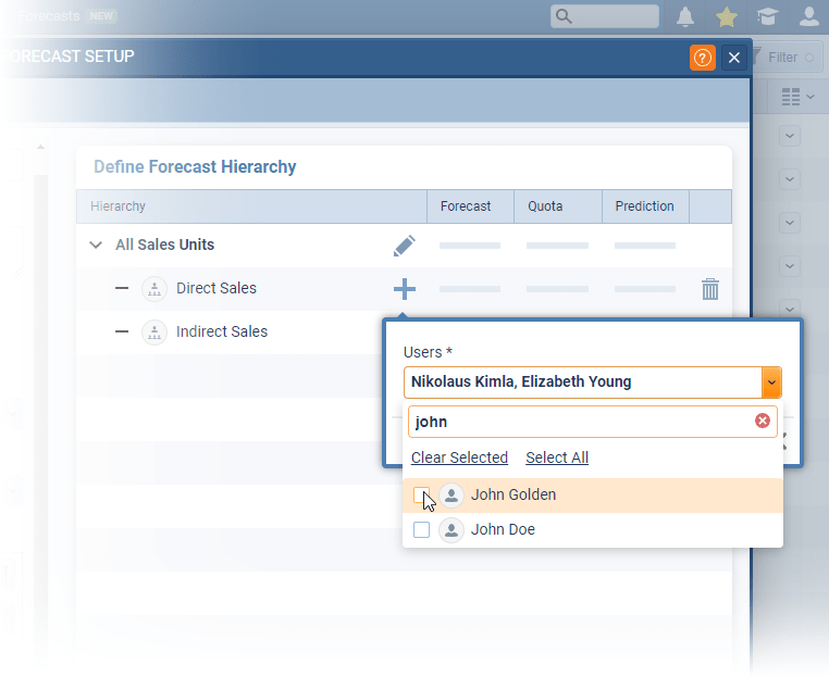 Choose your “Hierarchy” settings by selecting the top level and then add additional levels below. In the “Define Forecast Hierarchy” panel, you’ll then need to select which records to include in your “Forecast” — e.g. which “Sales Units” or which “Users“. ⤵