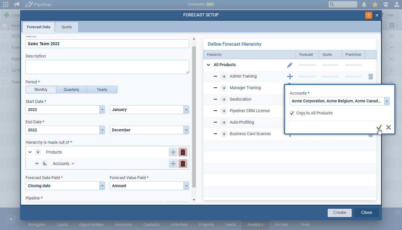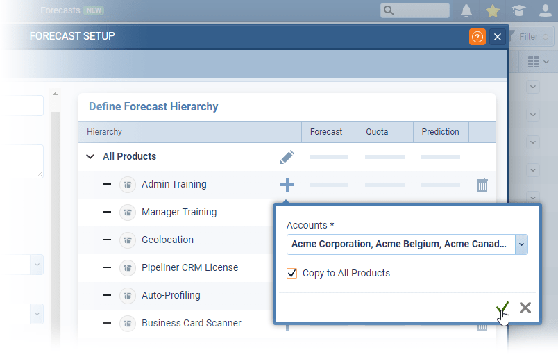 Once you’ve selected the Accounts to use, you can copy them to all the Products you have chosen to include so you don’t have to keep re-selecting them in each branch of your Forecast.