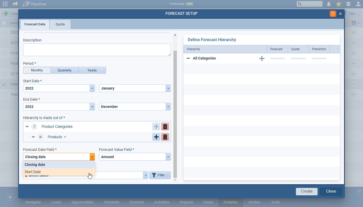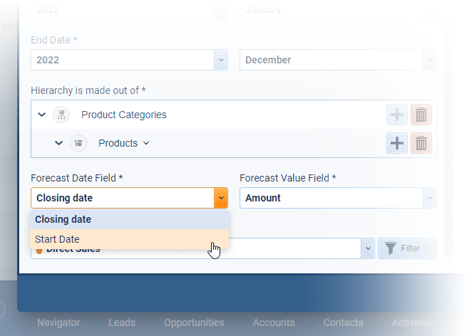 You can now also select the date you want to use for your Forecast date range from any system or custom date field. This could be “Closing Date” for Opportunities or any other custom date that you have created — perhaps a “Project Start Date” — or, if your Forecast is built on Products, this can be a custom “Product Line › Item Date” field that you have created. ⤵