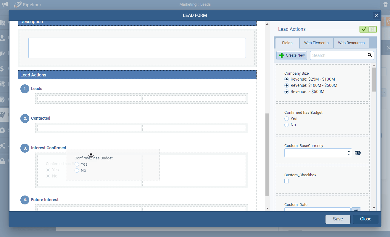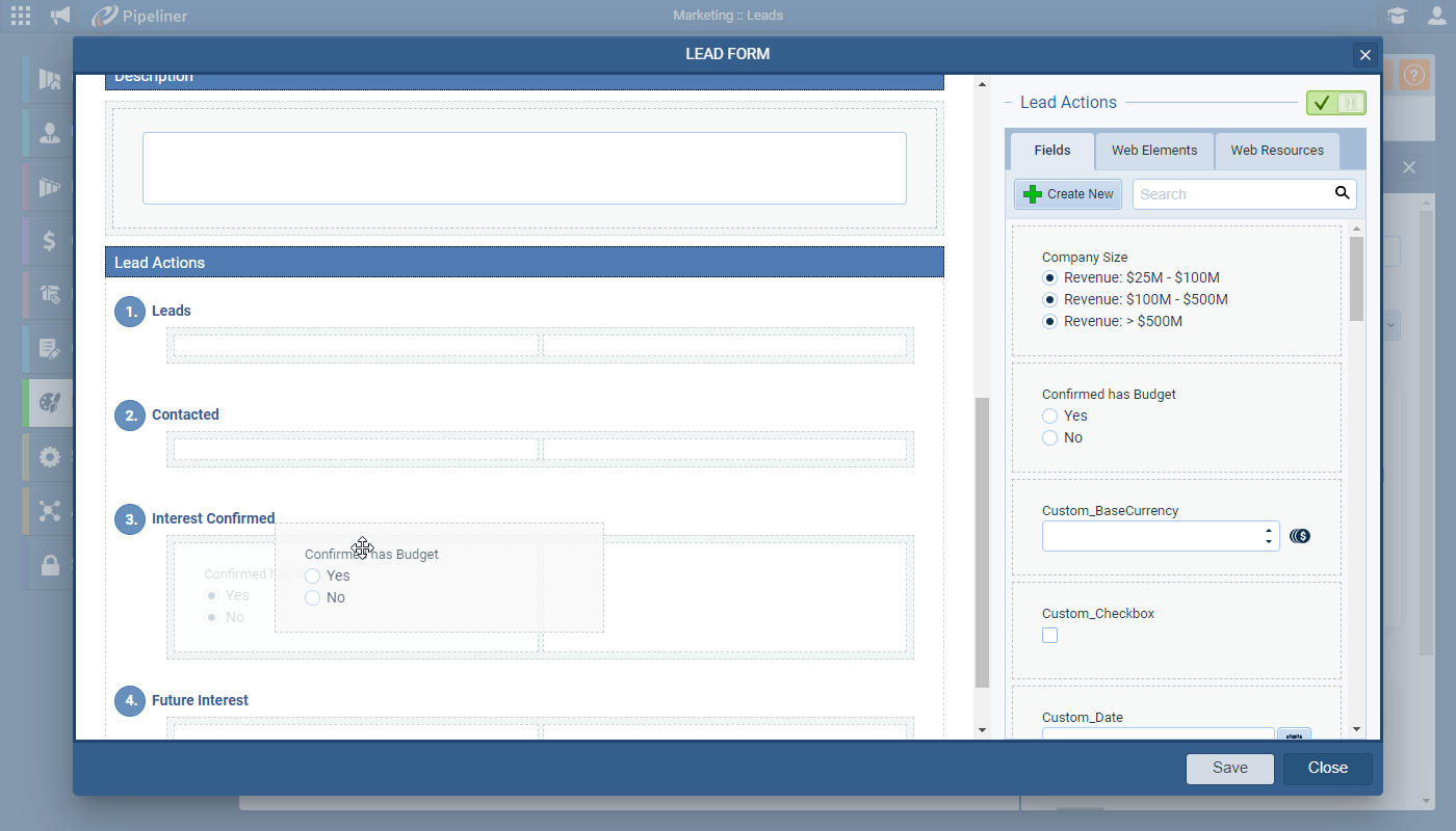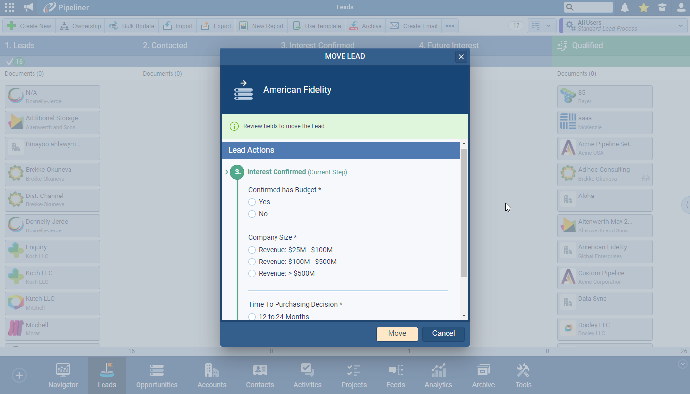 Once “Lead Action” fields have been enabled and added, the section that the fields are placed in on the Lead Form will only appear once the Lead reaches that step in the process. If those fields are not already completed, when the Lead is moved, a pop-up dialog box will appear which requires your users to complete those specific “Lead Action” fields that have not yet been filled in. The userUser User means a person who uses or consumes a product or a service, usually a digital device or an online service. will not be able to move that Lead to the next step until the required “Lead Action” fields are completed.
