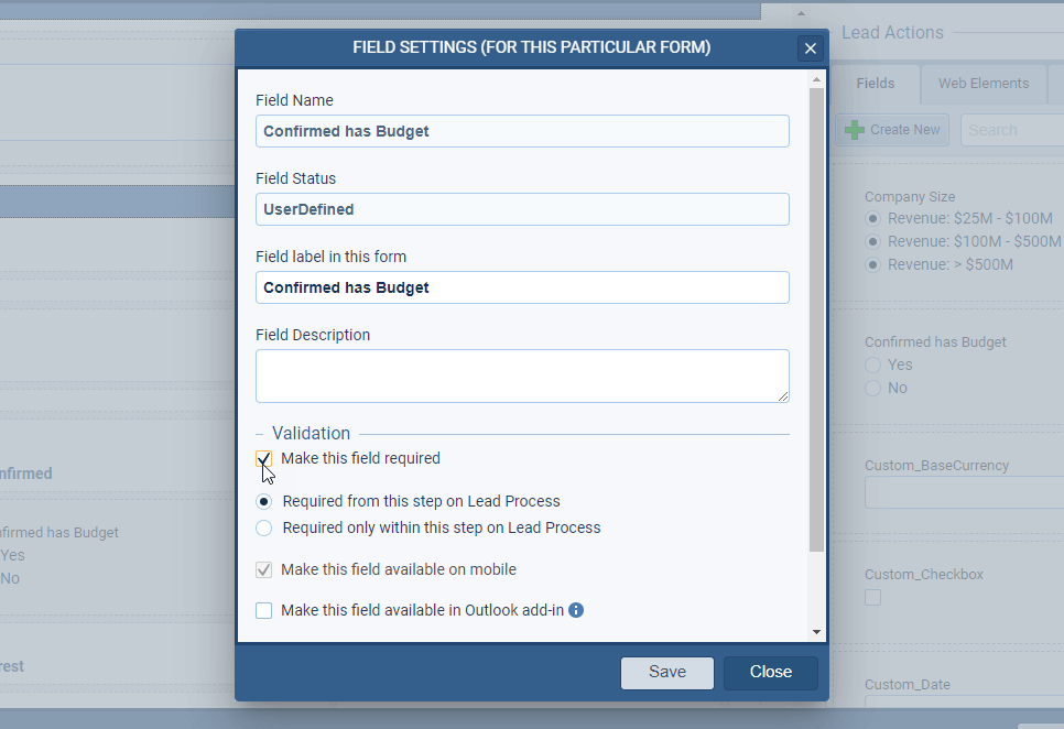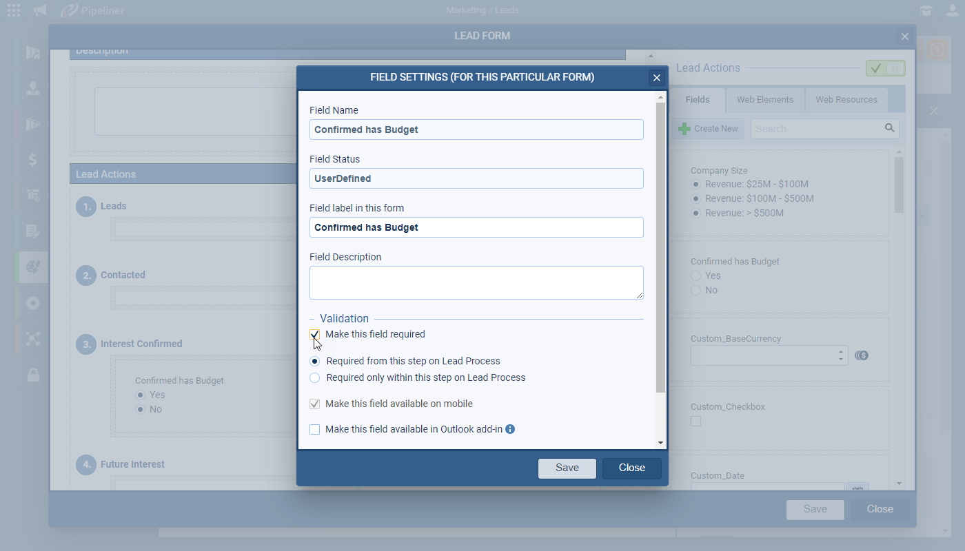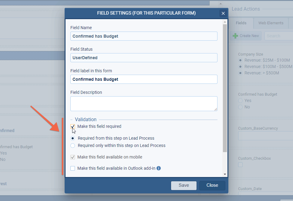 The “Field Form › Settings” can then be modified to set the field as required to include it in the pop-up dialogue box when a user moves a “Lead” into another step. ⤵