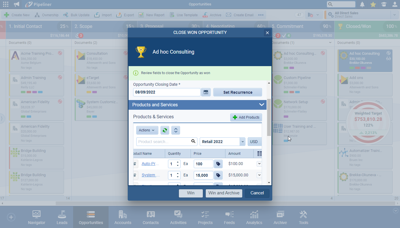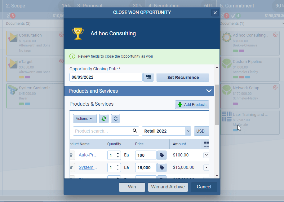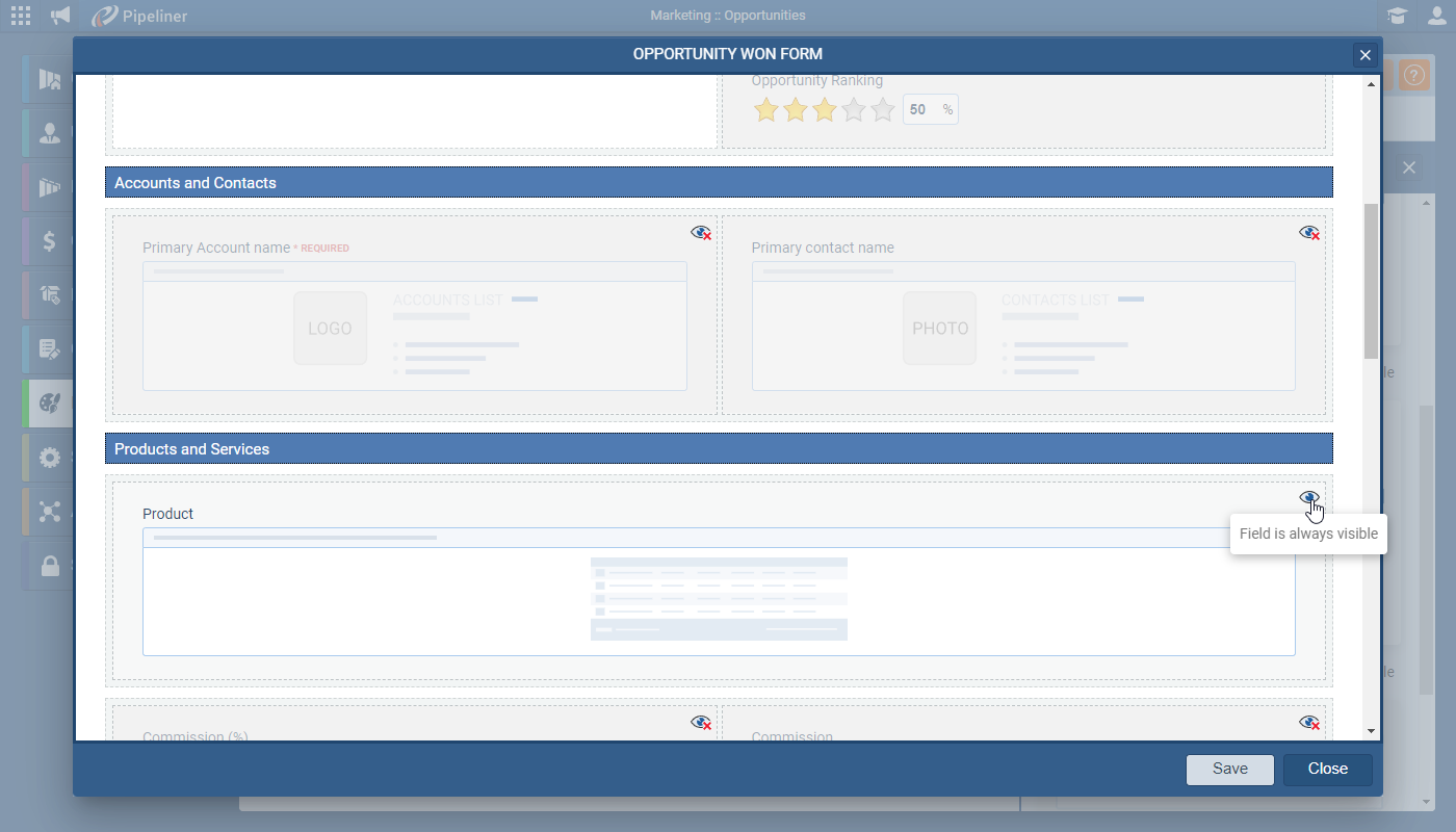 If you have multiple Opportunity processes, you can set up different “Qualification” and “Won Forms” for each one. All mandatory (required) fields (including system fields such as Name or Closing Date), calculated fields and fields that contain invalid data will always display on these Forms.