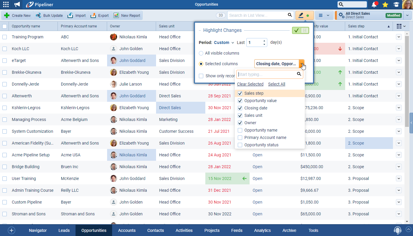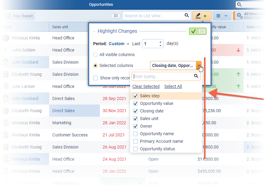 The date “Period”can be selected from one of the preset ranges a “Custom” number of days can be chosen and changes displayed for all fields in the List View or just selected fields. ⤵