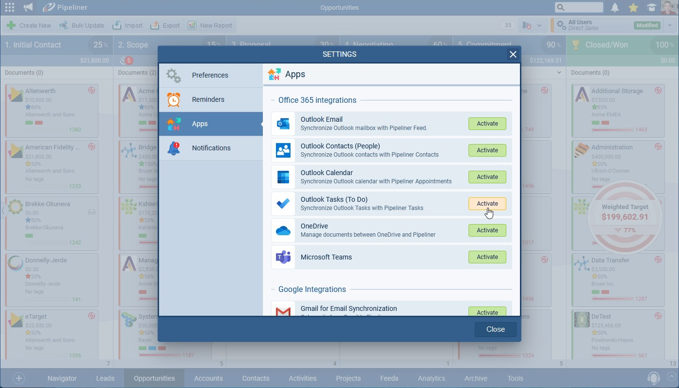 Users can select any folder that exists in the Outlook To-Do or can choose to have the integration create a dedicated folder “Coevera” with a pre-defined name. Clicking the “Activate” button will start the integration and run the initial synchronization, after that, changes are synchronized almost instantly. “Subject” and “Due Date” will sync in both directions between Coevera and O365 To Do.