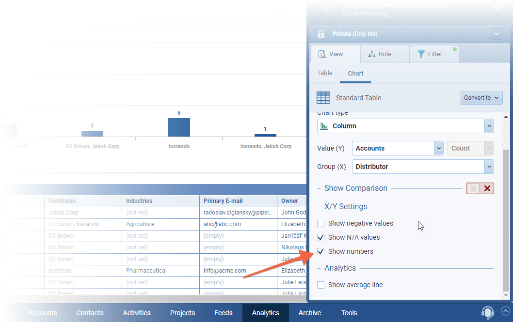There’s a new option “Show Numbers” in Chart settings which lets users show/hide the aggregate values directly on every column, point or slice in Charts (except for Scorecards). This new option is enabled by default on all charts. ⤵