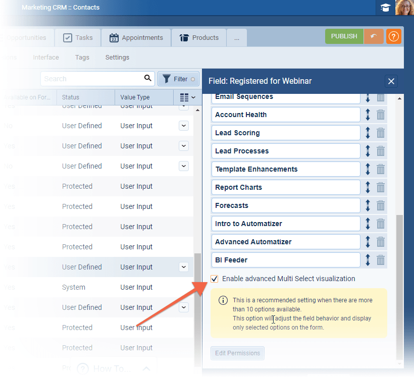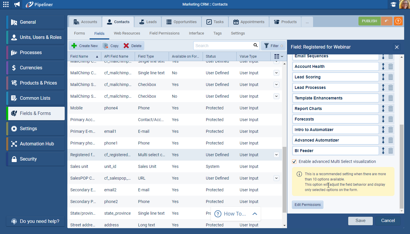 When using Multi Select checkbox fields with long lists (more than 10 options), the field can use up a lot of space on the Form. Now, Admins can “Enable advanced Multi Select visualization” for multi select checkbox fields in the Admin Module in Fields & Forms. ⤵