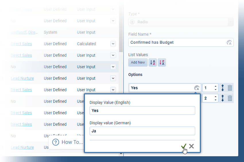 Field Names, Form Field Labels, Form Field Descriptions and items from validated lists — “dropdown values“, “multiselect checkbox lists” and “radio button” entries — can all be translated ⤵