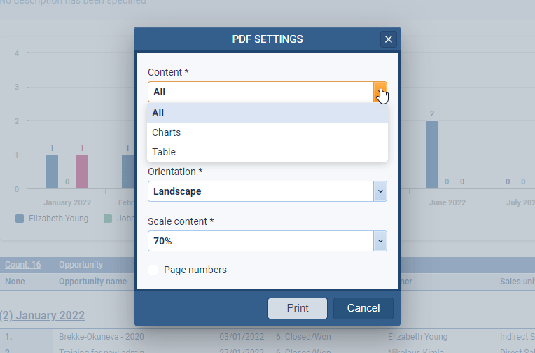 When printing a Report that includes a Chart, users can select whether to print both “Chart and Report” (All), just the “Chart” or just the “Report” ⤵