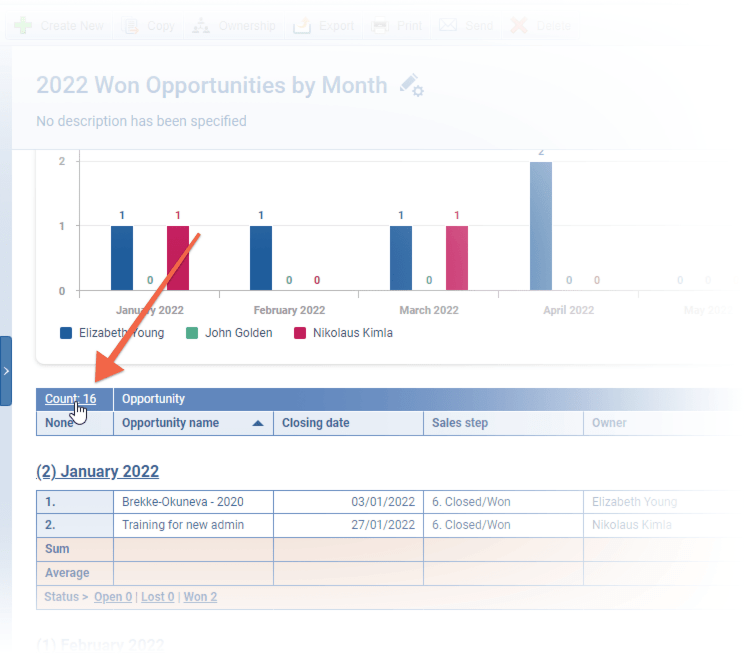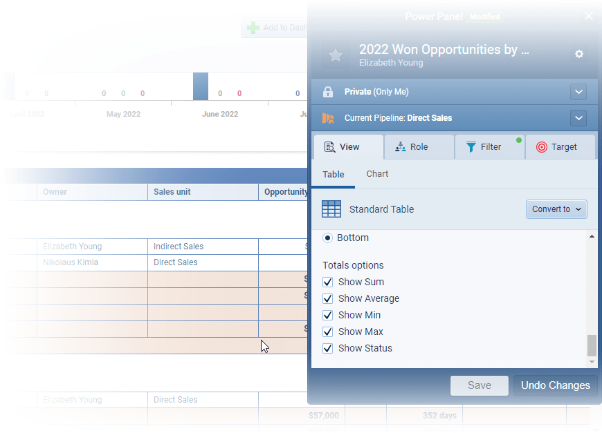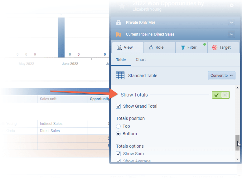 And we’ve added extra choices for the totals displayed. As well as “Show Sum” and “Show Average”, you can now also enable (or disable) “Show Min”, “Show Max” and, for Opportunity and Lead Reports, “Show Status” ⤵