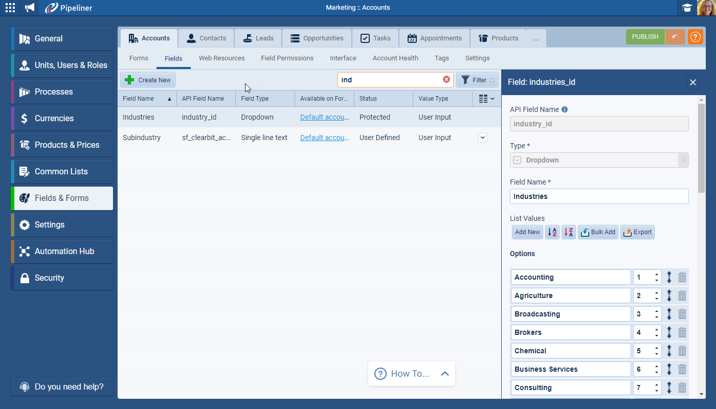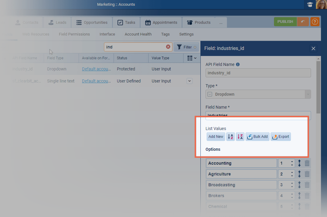 Select an existing “Dropdown“, “Multi Select Checkbox” or “Radio” field and the “Bulk Add” and “Export” buttons will be available. For a new field, create and save the field and the options will then display when the new field is selected ⤵